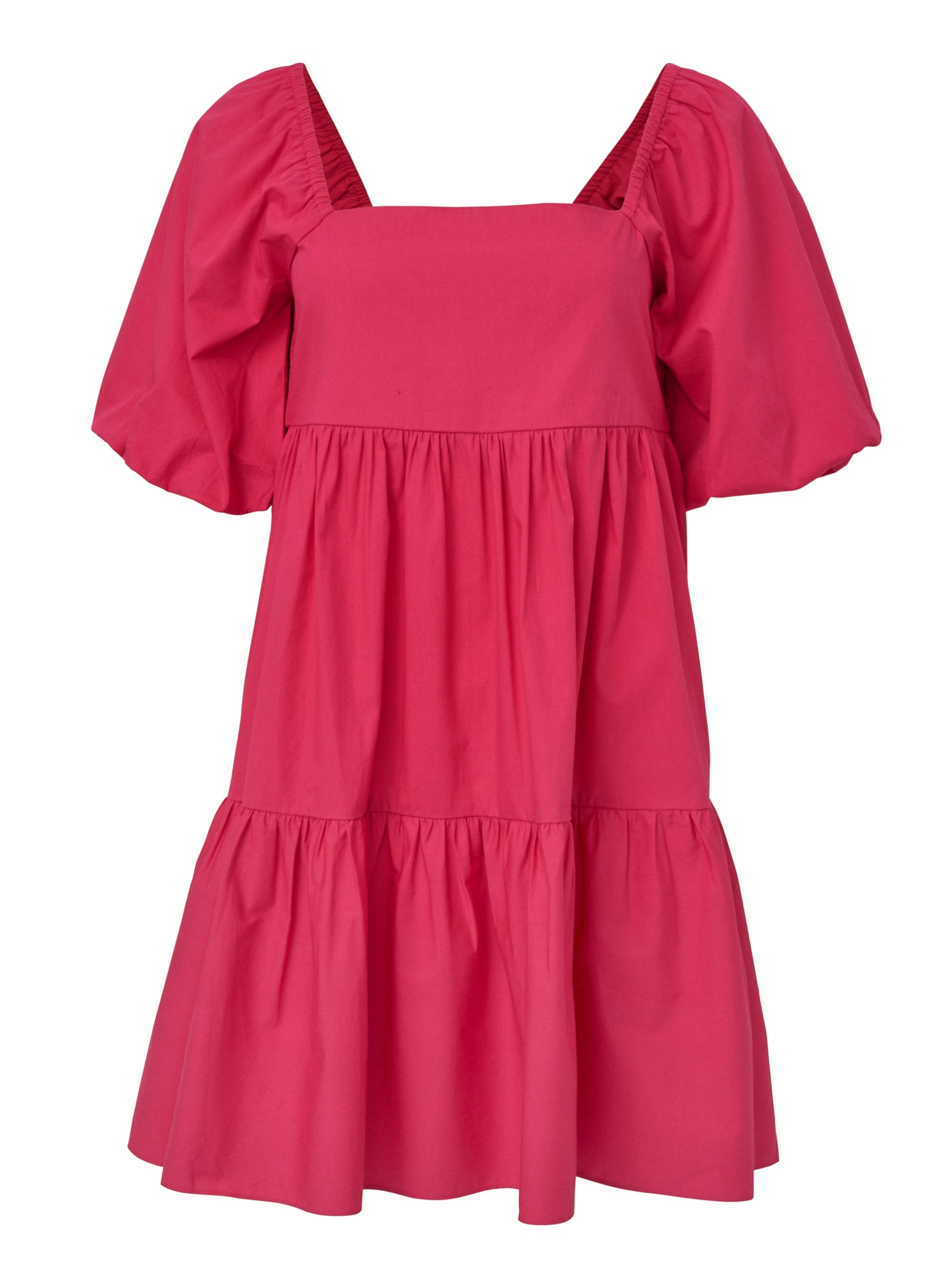 Oversize puff sleeves and a tiered babydoll design bring volume to this twirl-worthy mini dress. Smocking at the back panel ensures a flattering fit along the square neck and back. while the draped fabric flares out from the empire waist giving you room to move through any occasion.* Sizes: XS (2). S (4-6). M (8-10). L (12-14). XL (16)* Plus sizes: 1X (18-20). 2X (22-24). 3X (26-28)* 34" approx. length; varies by size* Tiered babydoll cut* Puff half sleeves* Smocking at back panel* Fabric does not have stretch* Cotton. Imported