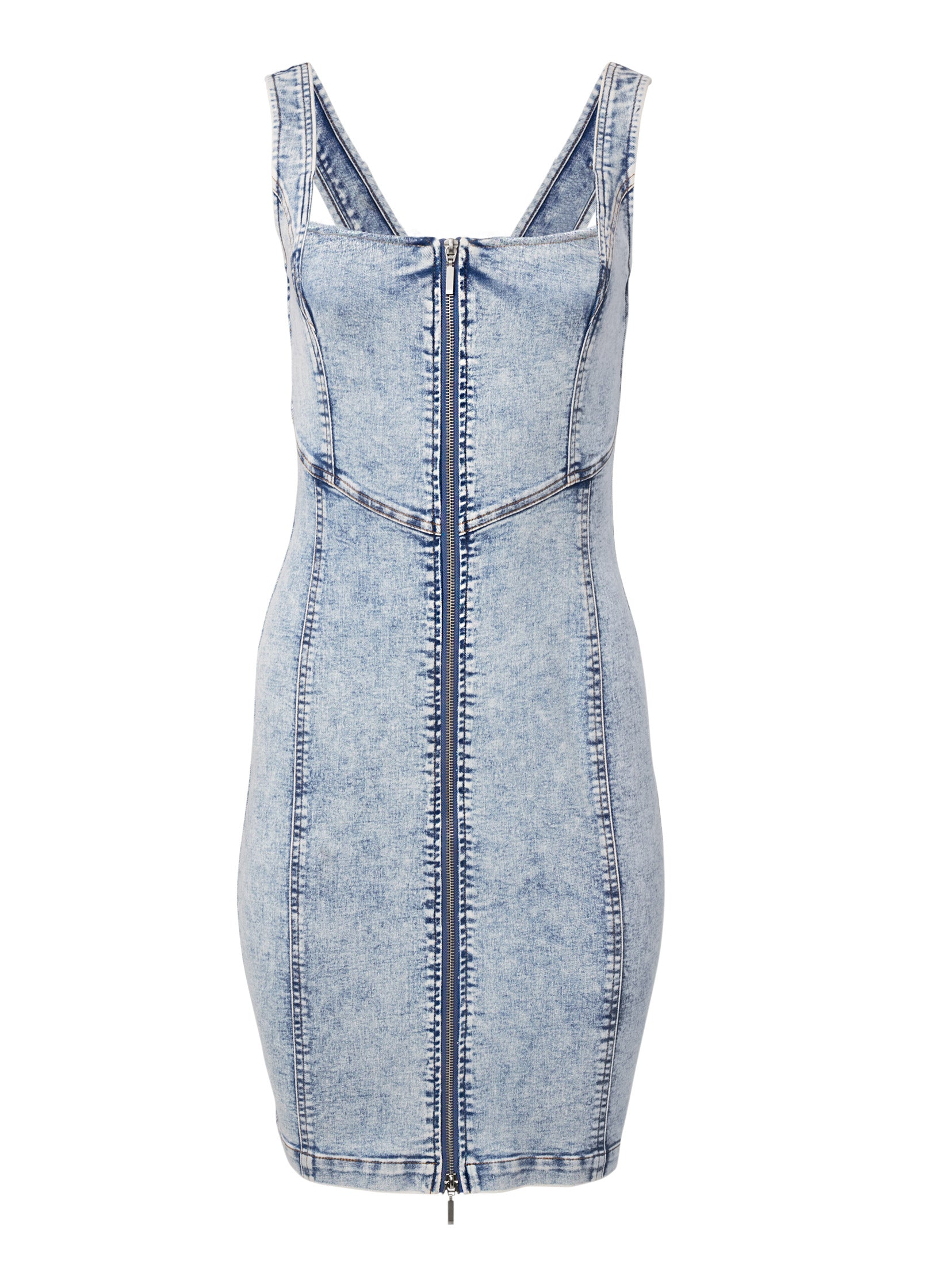 A mini dress with maximum wow. this denim bodycon boasts a sleeveless. wide-strap top and sweetheart neckline in a trendy acid wash. The zippered front closure lets you decide how much to reveal while strategically-placed seams on front and back highlight your natural curves.* Available in plus sizes* Sweetheart neckline* Front zipper closure* Sleeveless* Bodycon fit* 37" approx. length; varies by size* Fabric has stretch* Cotton/poly/elastane. Imported