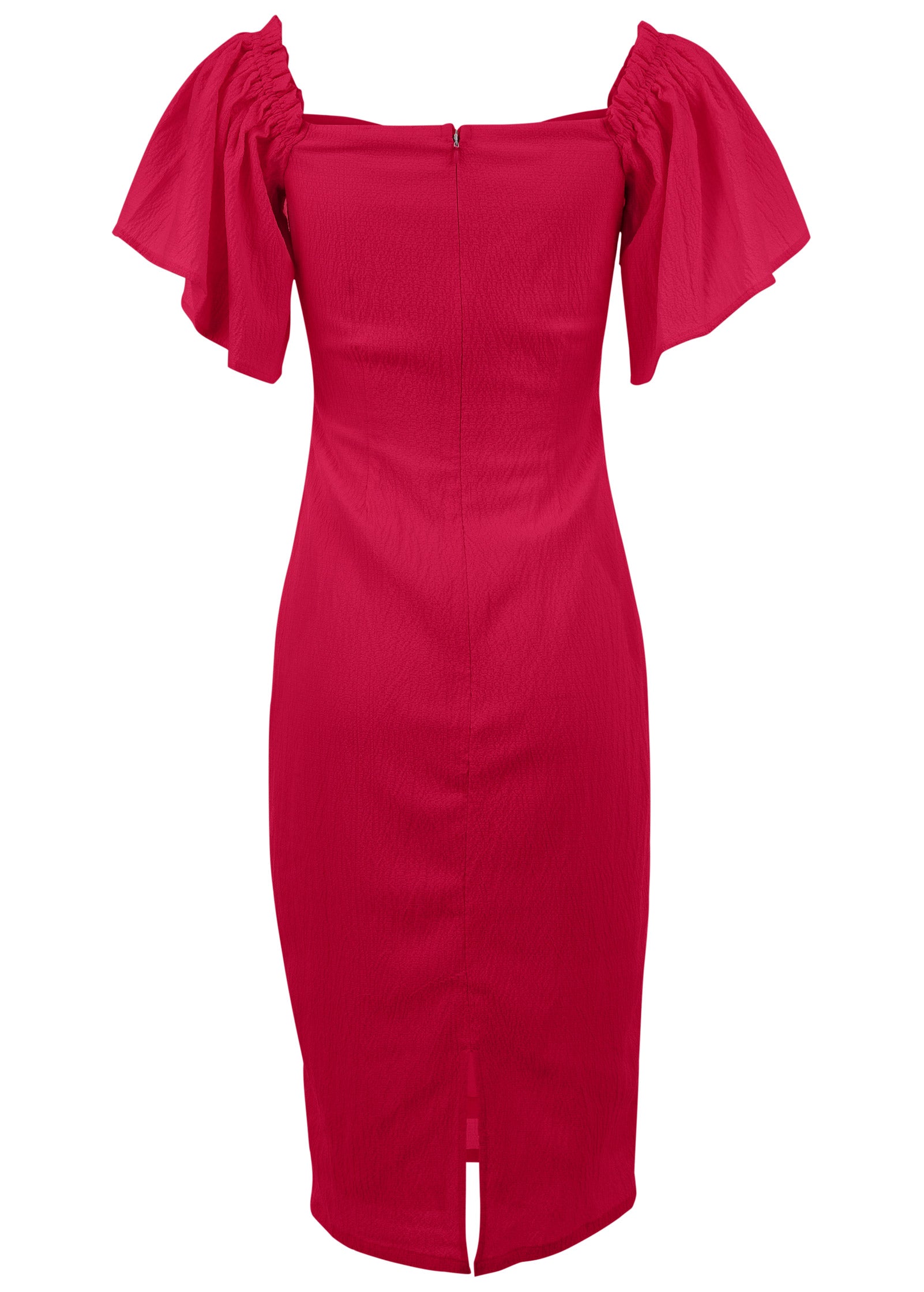 Floaty flutter sleeves up the feminine feel of this off-the-shoulder midi dress. That and the sweetheart-shaped neckline which perfectly frames your décolletage. This sheath silhouette skims over your curves. landing below the knee for a sophisticated look. Reach for it for weddings. date nights. showers. or any other dressed-up occasion.* Item runs small; Size up for a better fit* Off-the-shoulder* Midi length. 36.5"* Invisible back zipper closure* Fully lined* Polyester/Lycra. Imported