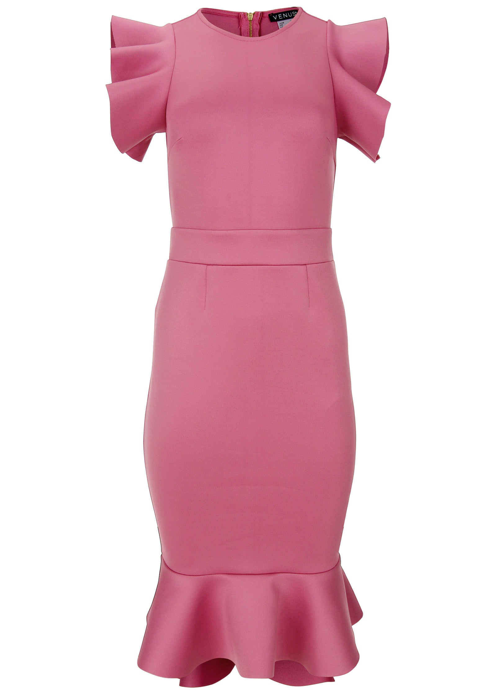 Meet your curves' new best friend. This knee-length dress is an all-occasion dream. nailing the dress code for everything from showers and parties to weddings and more. Ruffle details at the sleeves and hem add a feminine touch. while the sleek bodycon fit flatters from top to bottom.* Sizes: XS (2). S (4-6). M (8-10). L (12-14). XL (16)* Plus sizes: 1X (18-20). 2X (22-24). 3X (26-28)* Knee length; from shoulder; 42" missy. 44" plus* Flutter sleeves* Back zipper closure* Ruffle hem* Polyester/spandex. Imported