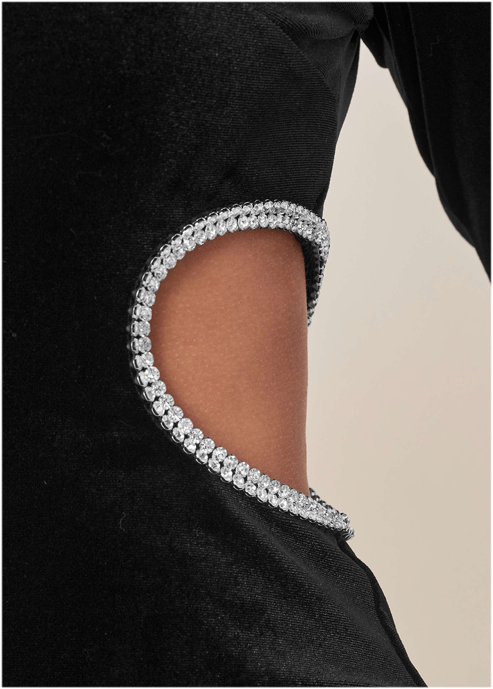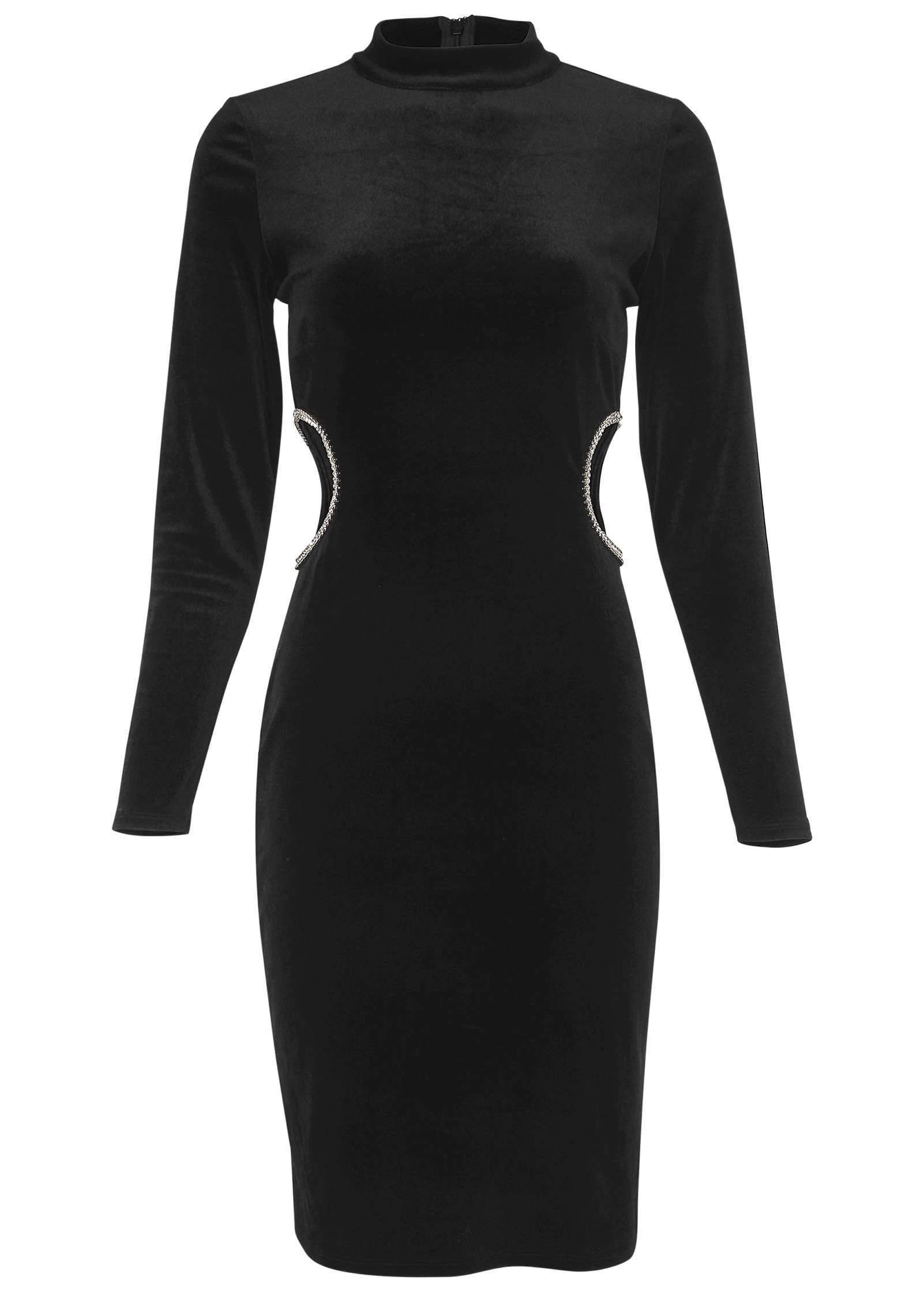 This long-sleeved dress is a definite YES! It's made in our fan-fave stretch velvet that's ultra plush and super comfy. hugging every curve for a sultry figure-highlighting fit. Spicy side cutouts add serious sizzle. while sparkling rhinestone embellishments take the luxe vibes to the next level. Play up the glam with blinged-out earrings and metallic heels for a look that wows.* Sizes: XXS (00-0). XS (2). S (4-6). M (8-10). L (12-14). XL (16)* Available in petite sizes* Long sleeves* Side cutouts* Knee length: 38” missy; 36" petite* Rhinestone embellishment* Polyester/elastane. Imported