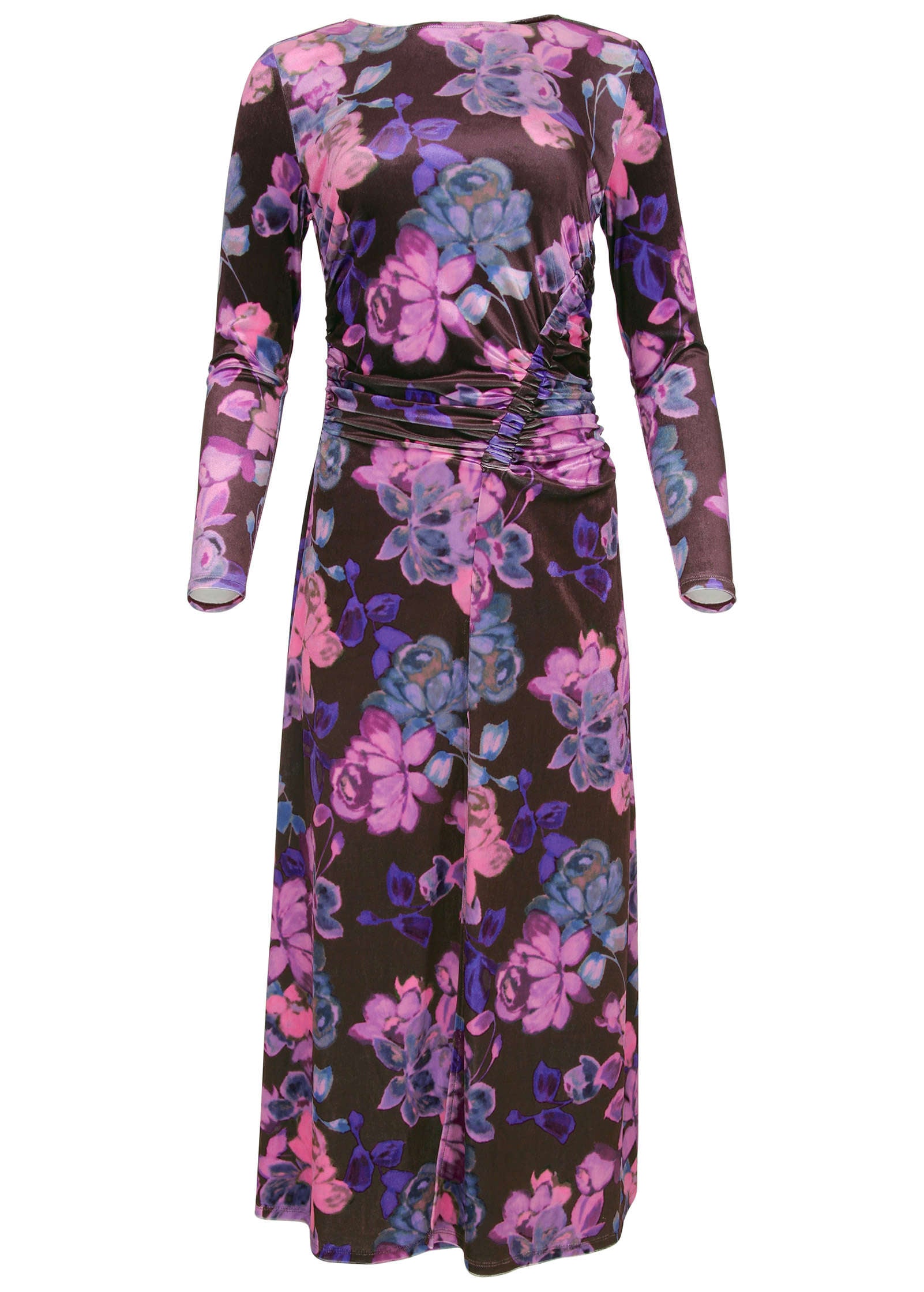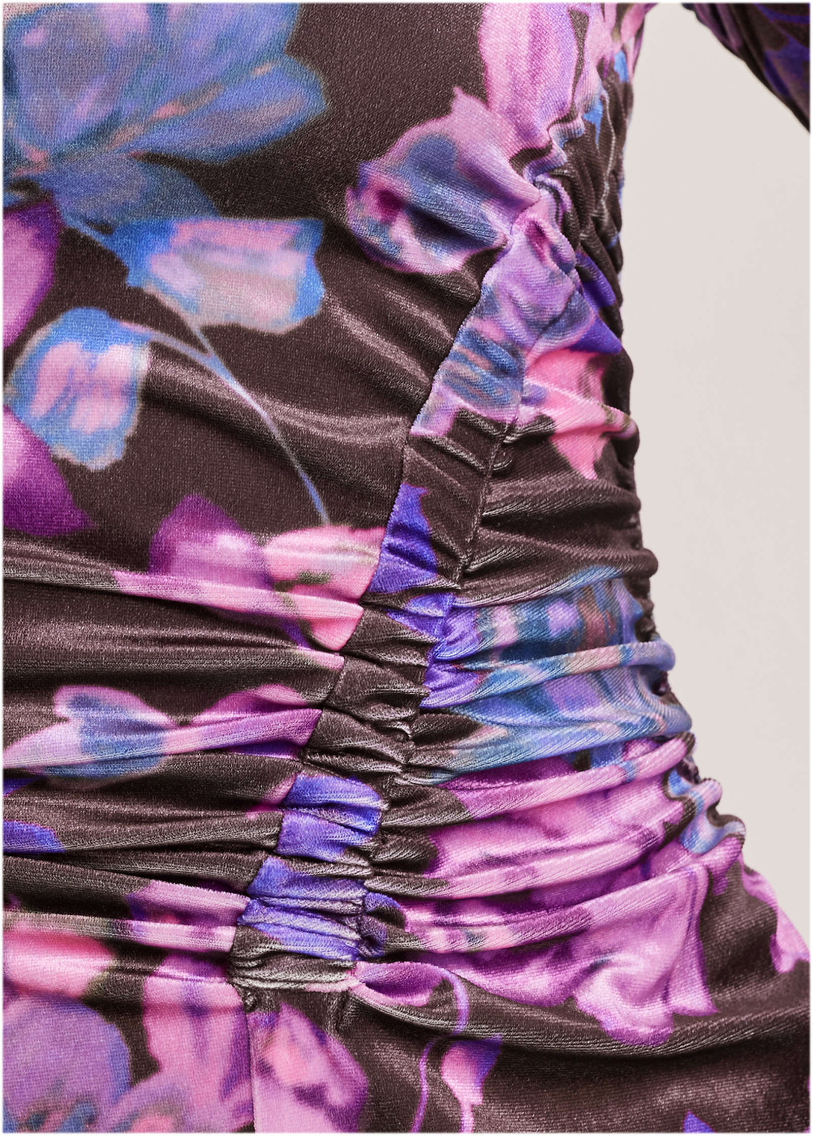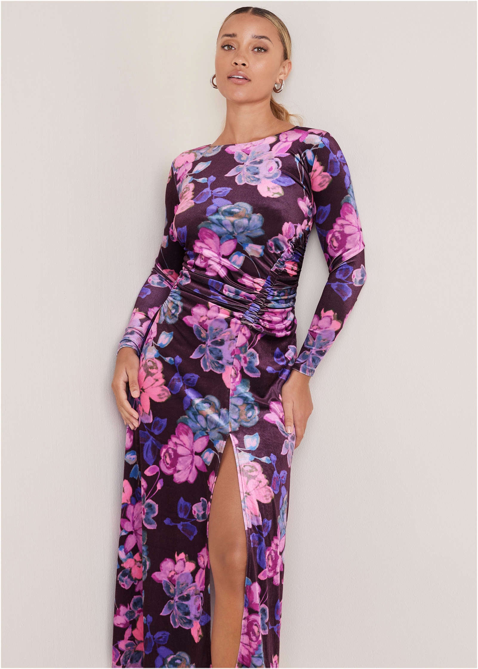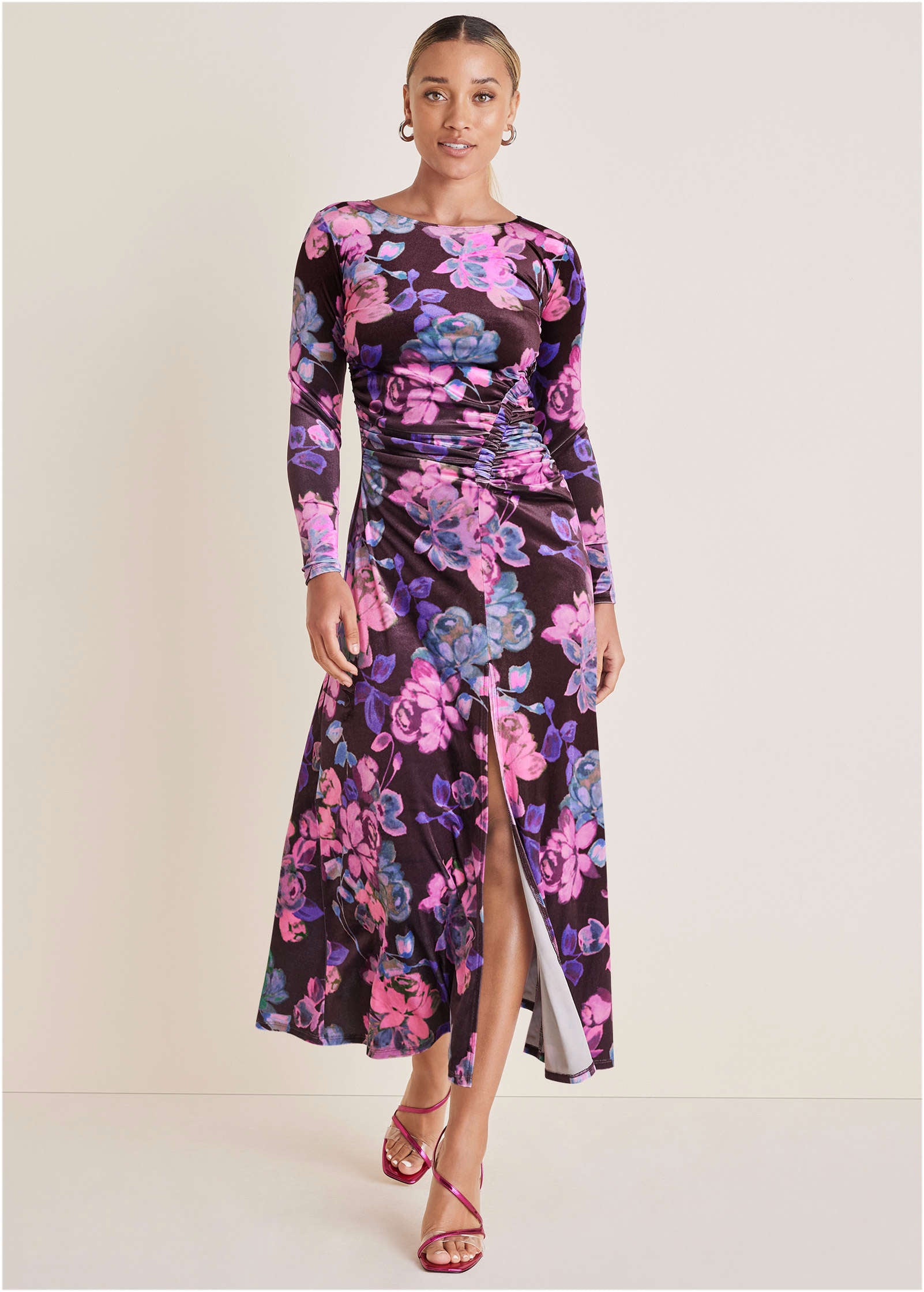 Prepare to crush hard on this velvet maxi dress (and then add-to-bag). Not only is the plush fabric extremely soft to the touch. it's also designed with comfy stretch (!!!)—a total party-season win. From the ruching at the waist that flatters your shape to the skirt slit that adds just enough sizzle. this dress gives chic. chic. CHIC.* Sizes: XS (2). S (4-6). M (8-10). L (12-14). XL (16)* Plus sizes: 1X (18-20). 2X (22-24). 3X (26-28)* Long sleeves* Front slit* Maxi length* Polyester/elastane. Imported