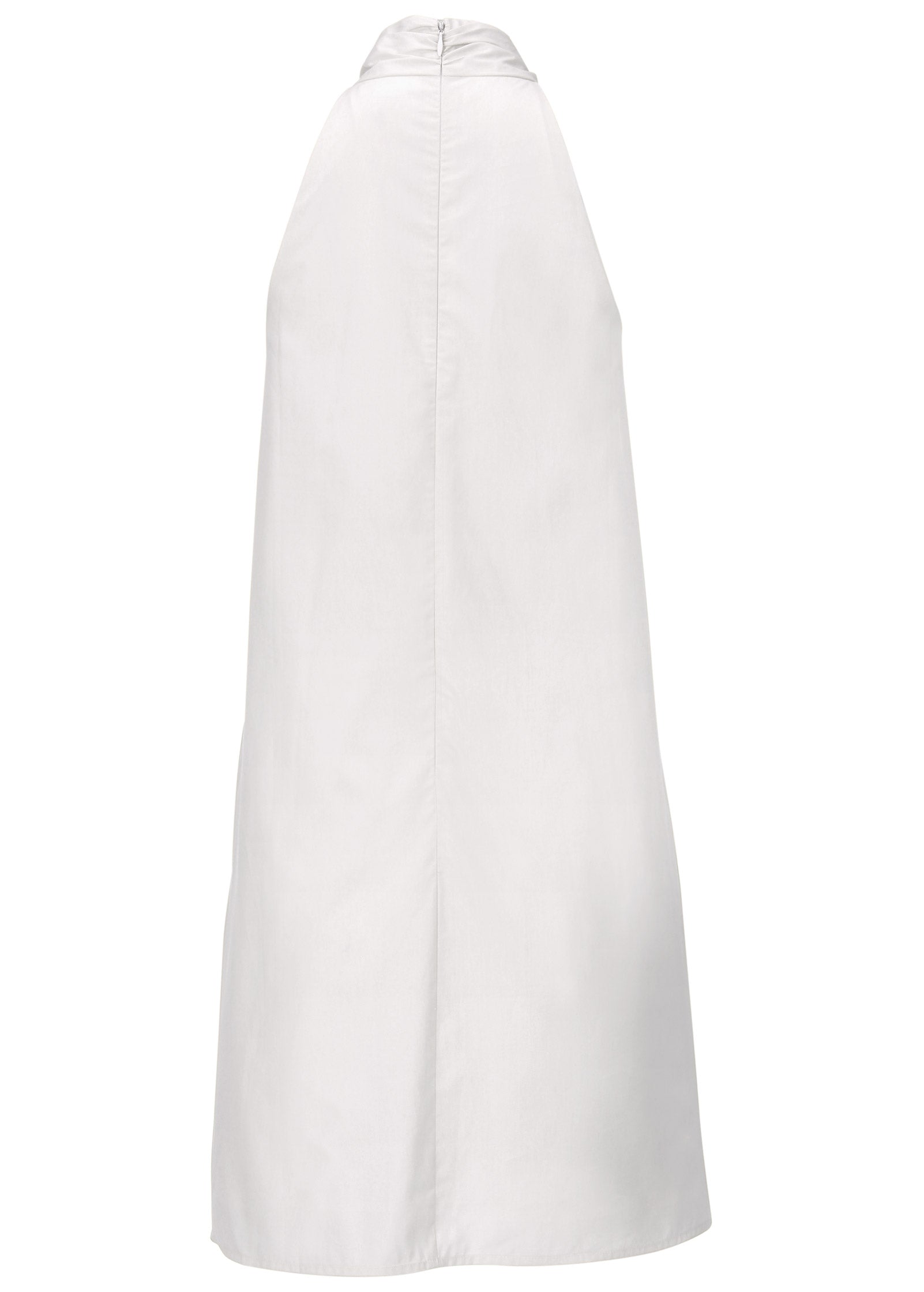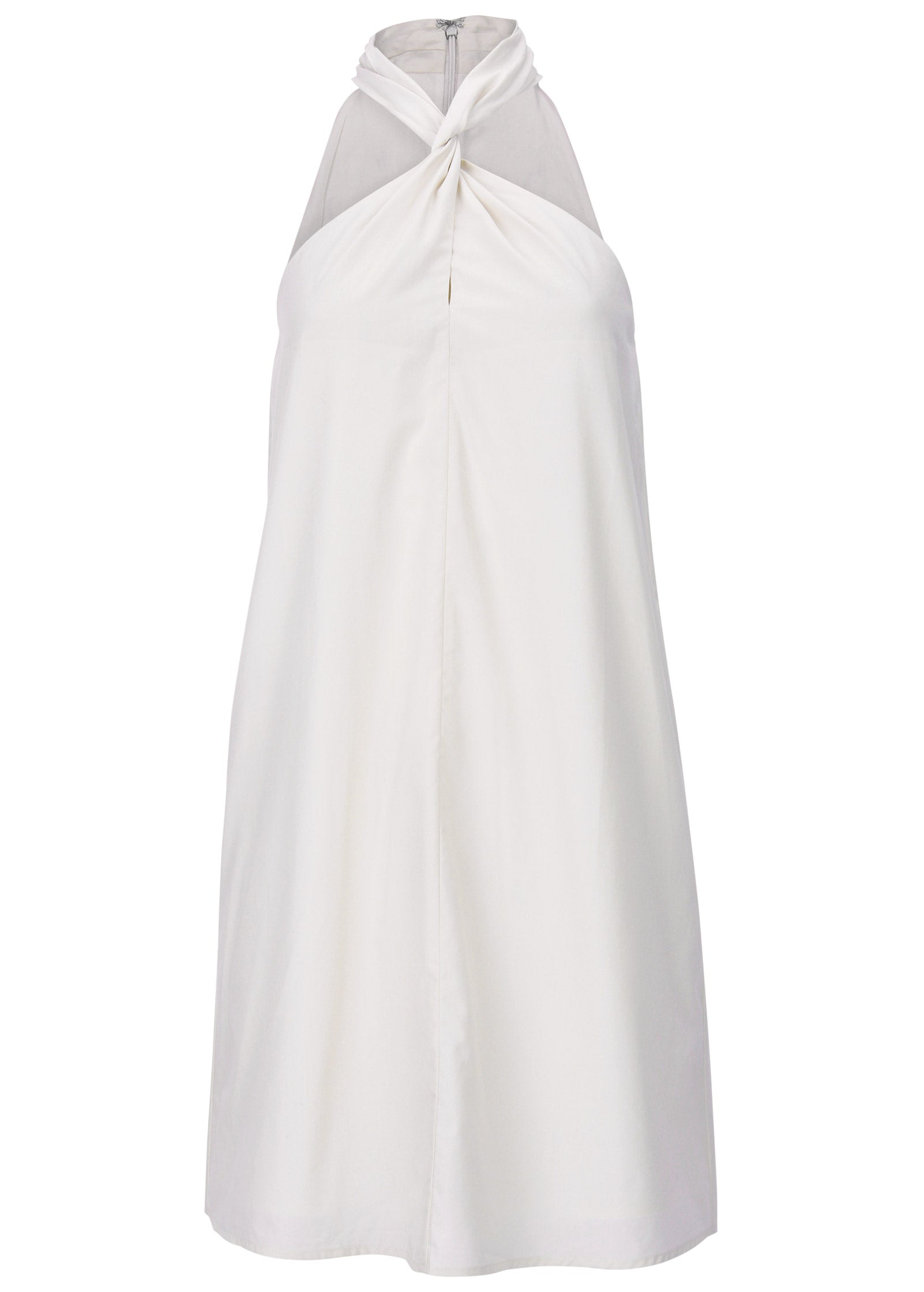 Hot and humid weather doesn't stand a chance against this mini dress. Done in our Clean Cut Cotton shirting fabric. it's breathable and durable with a crisp. cool-to-the-touch feel. To strike a balance we gave this A-line shift an elegant twisted halter neckline to add the perfect amount of softness. Wear it as-is or belt the middle to accentuate your waist.* Sizes: XS (2). S (4-6). M (8-10). L (12-14). XL (16)* Mini length. approx. 34" from shoulder* Twisted halter neck* Invisible back zipper closure* Fully lined* Clean Cut Cotton (Cotton: CmiA. Imported)