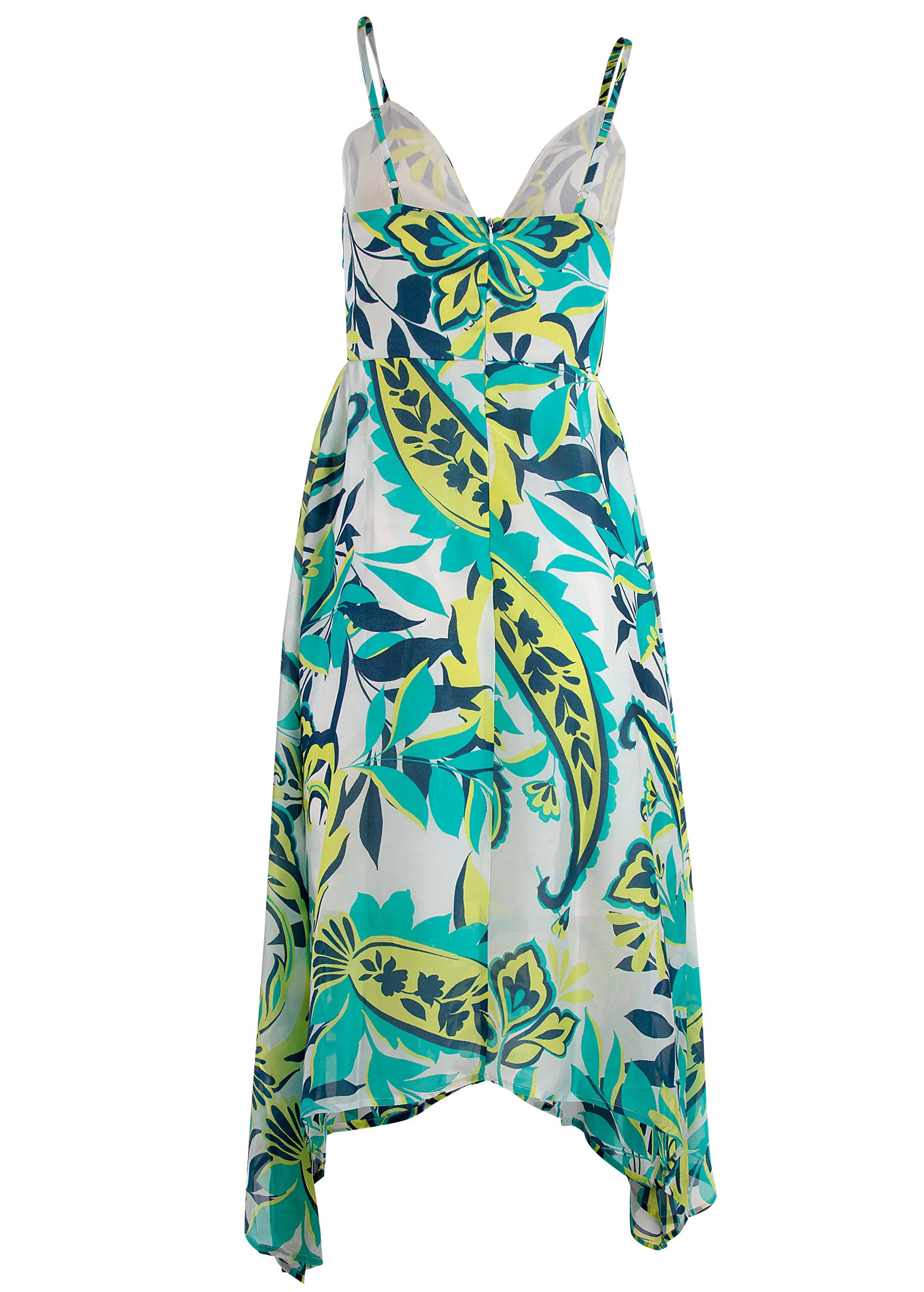 Easy. breezy and totally twirlable. this dress guarantees an instant 10 outfit. From the delicate spaghetti straps to the eye-catching handkerchief hem. it's warm-weather perfection. Dates. weddings. parties. lunches—this midi works for it all.* Item runs small; size up for a better fit* Adjustable spaghetti straps* V-neck* Invisible back zipper closure* Midi length approx. 39"* Lined* Polyester. Imported