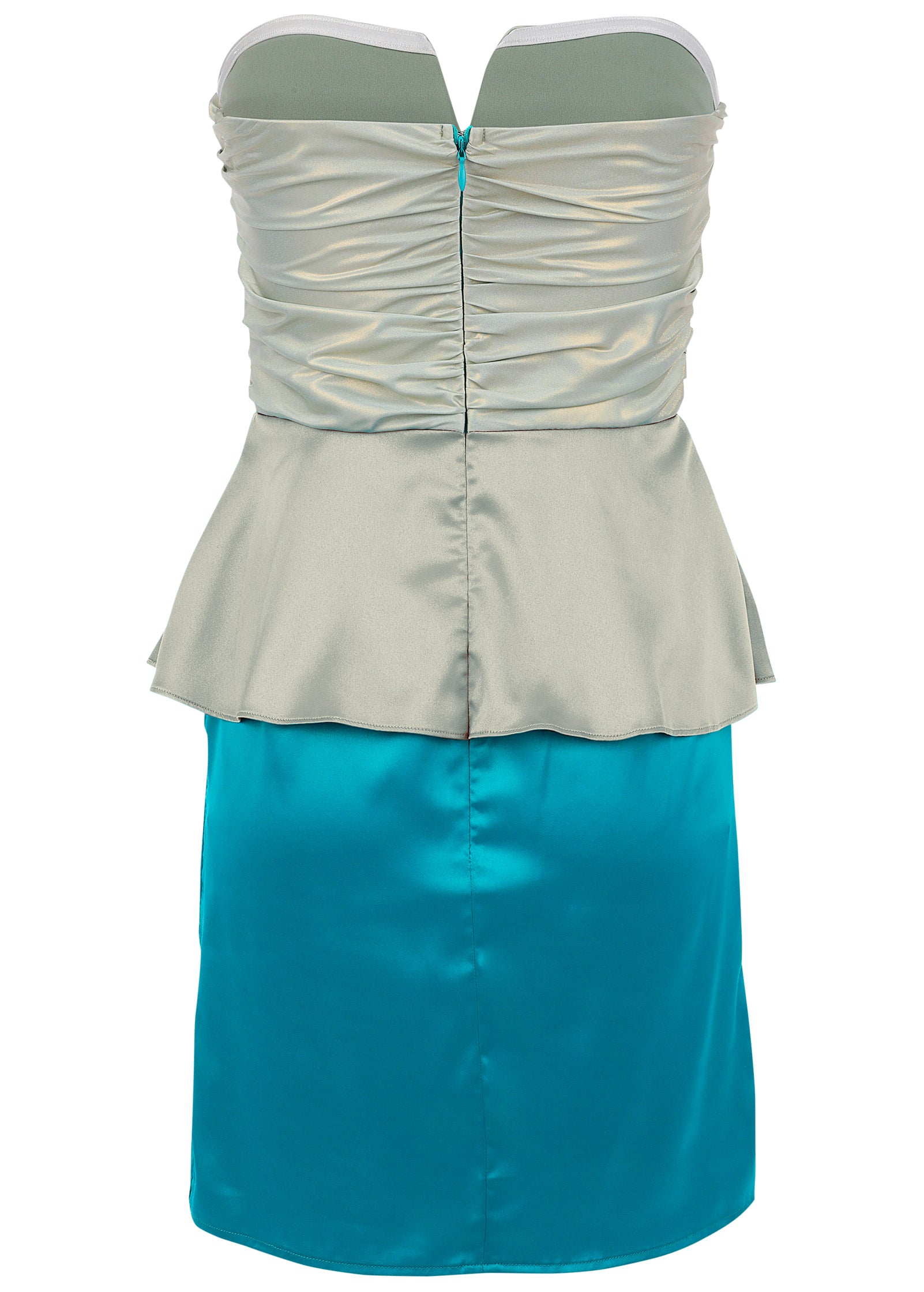 Get ready to make a splash in this playful strapless mini dress. Everything from the shimming metallic bodice and the fluttery peplum waist to the blue-hued skirt is giving mermaidcore vibes. While it may be ethereal. the silky piece makes a bold statement.* Item runs small; size up for a better fit* Strapless* Peplum waist* Mini length approx. 28"* Invisible back zipper closure* Unlined* Polyester/spandex. Imported