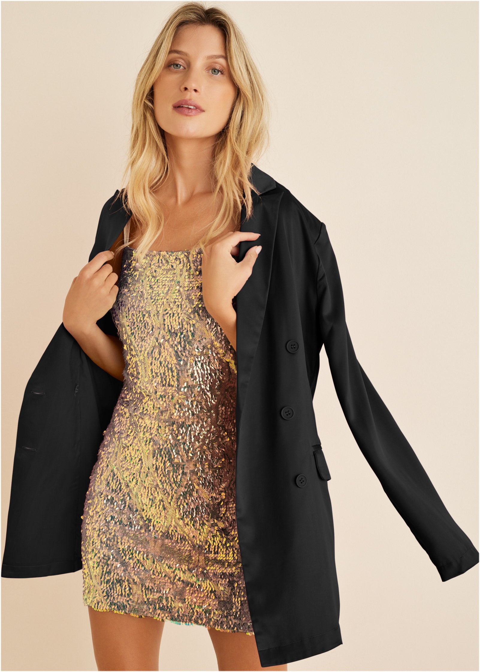 You send in the RSVP. we've got the dress covered. This sequin mini is pure glam with allover iridescent sequins that shimmer and shine bright from every angle. practically begging to be taken for a spin on the dance floor. Toss an oversized menswear-inspired blazer over your shoulders. slip on strappy heels and best-dressed guest status is yours.* Sizes: XS (2). S (4-6). M (8-10). L (12-14). XL (16)* Spaghetti straps* Bodycon fit* Mini length* Allover sequins* Invisible back zipper closure* Lined* Nylon/spandex. Imported