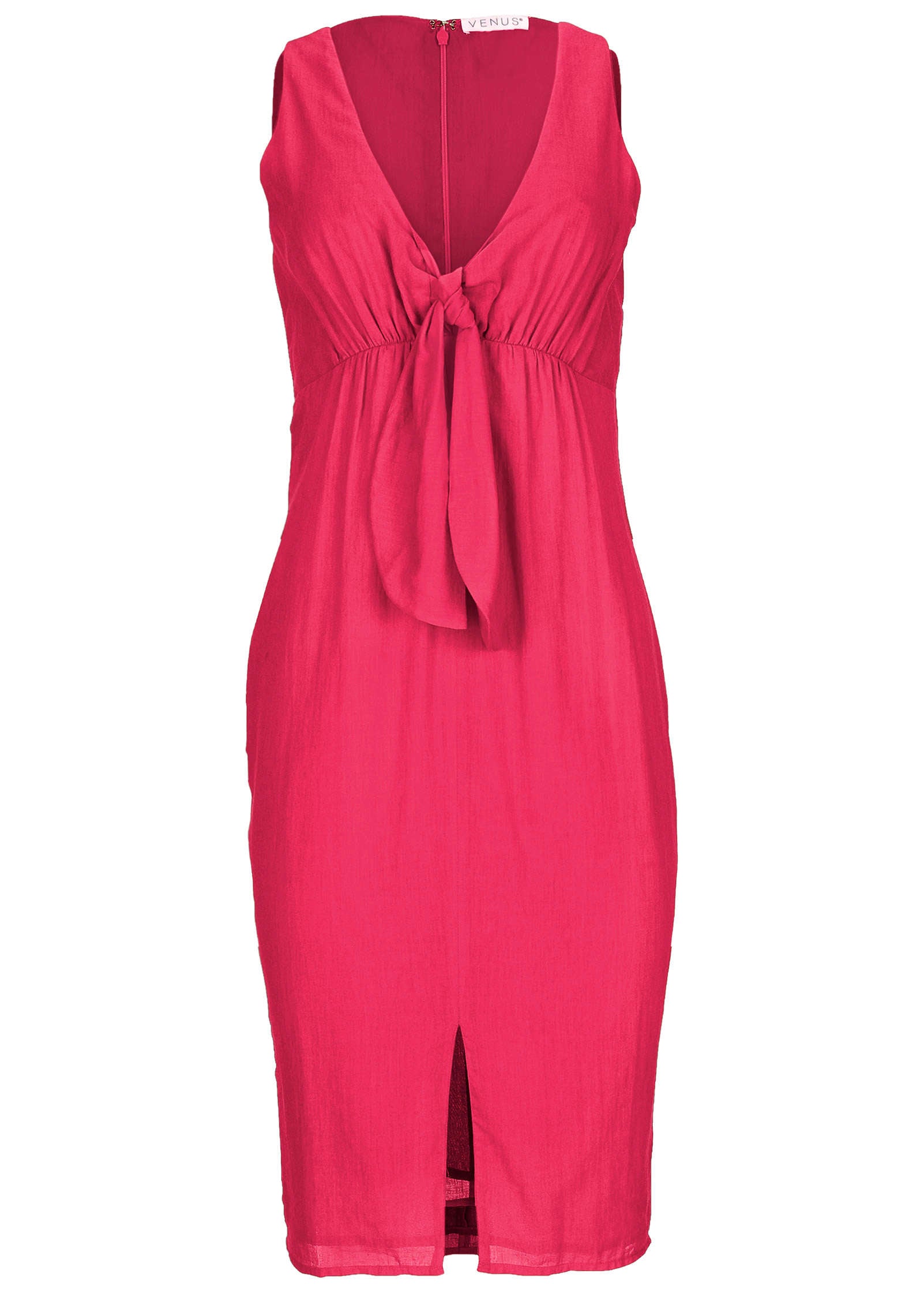 This dress is a summer must-have. For sunny days or steamy nights. it goes the distance. The curve-skimming fit features a bold plunging neckline that's softened with a playful tie-detail. and the midi is finished with a flirty front slit. Easy cotton fabric makes it comfortable even in the hottest temps.* Available in plus sizes* Sleeveless* Deep V-neckline* Tie detail at bust* Front slit* Midi length* Back zipper closure* Lined* Fabric does not have stretch* Cotton (CmiA). Imported