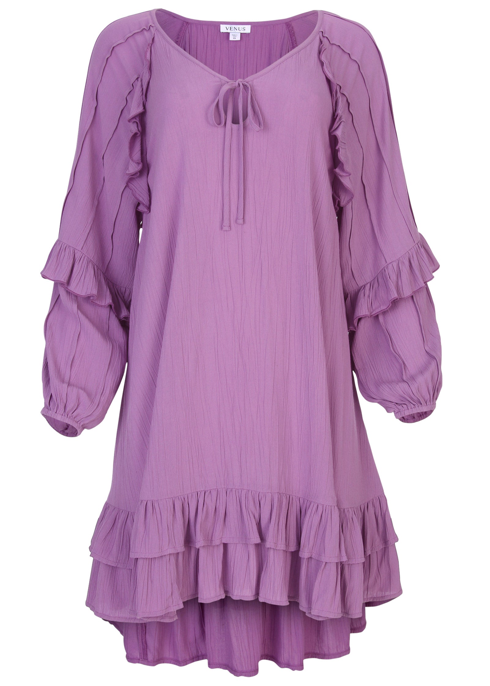 This lively mini dress has something up its sleeves: ruffles! With frilly. feminine details along the arms and at the hem. this dress ruffles up some flair in your wardrobe. Its long sleeves and tie neckline create a modest look that transitions effortlessly from season to season.* Sizes: XS (2). S (4-6). M (8-10). L (12-14). XL (16)* Plus sizes: 1X (18-20). 2X (22-24). 3X (26-28)* Long sleeves* Tie neckline with keyhole detail* High-low hem* Mini length. approx. 35" in front. 37" in back from shoulder* Viscose. Imported