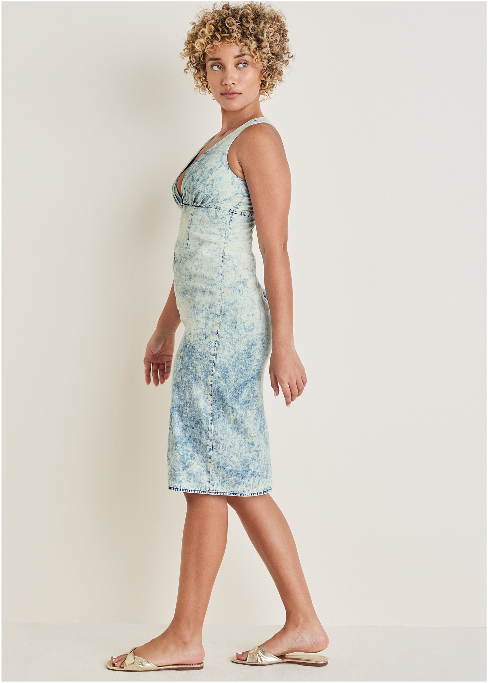Denim definitely got the memo to take it easy this summer! This sun-bleached denim dress is laid-back and carefree with its unique acid wash that looks like it spent hours in the sun. With a bold plunging neckline and flirty front slit in the skirt. this midi dress is ready for warm days and hot nights alike.* Available in plus sizes* Sleeveless* Plunge neckline* Back zipper closure* Front slit* Midi length. 42" from shoulder* Cotton (CmiA). Imported