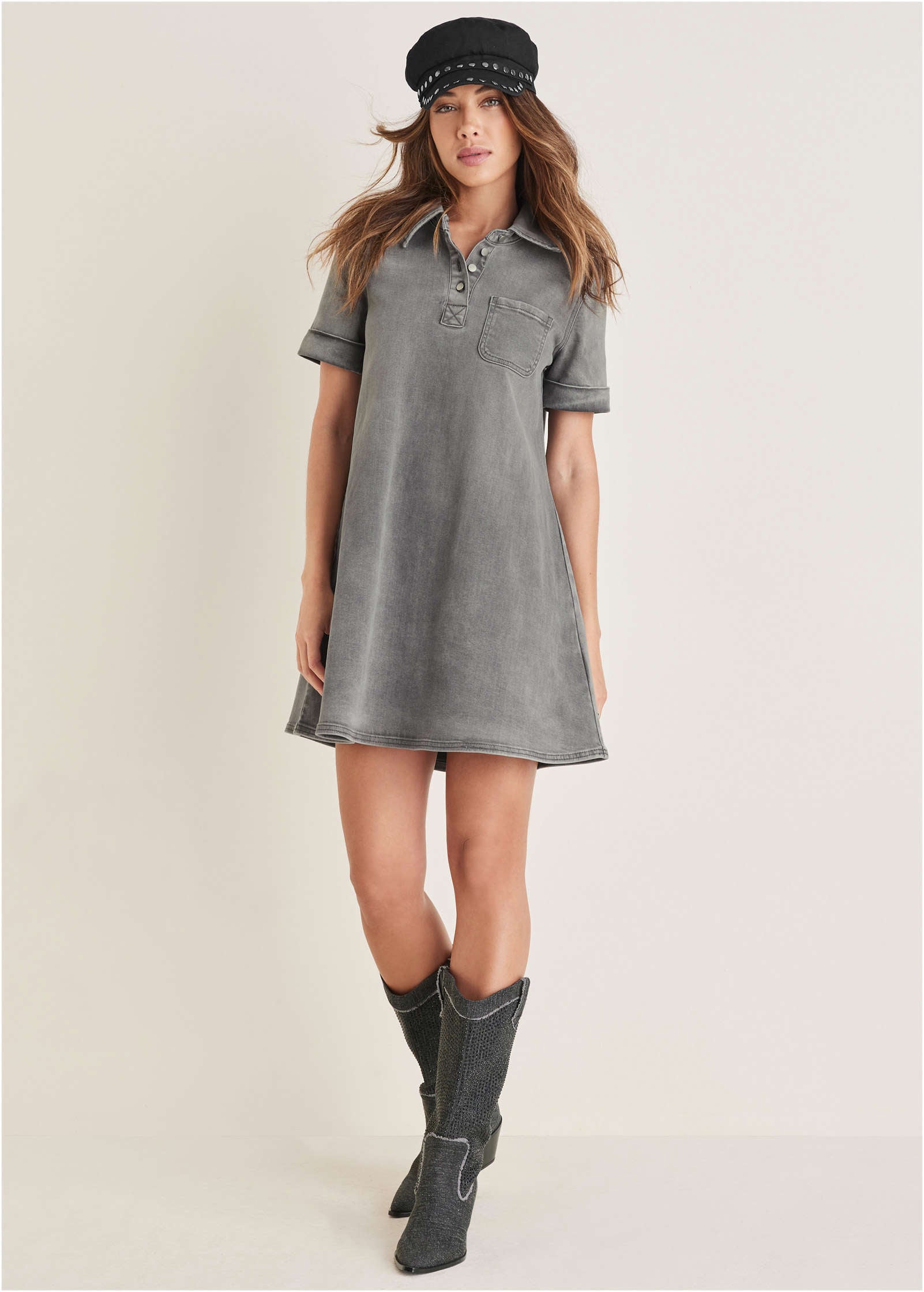 Our denim's too good to gatekeep to just jeans: enter this playful denim mini dress. With a collared neckline and swingy shape. it's a fun updated take on a classic shirt dress. A hint of stretch makes it super comfy. earning it a place in your weekly outfit rotation. We love it paired with boots. booties. sneakers. sandals—you name it!* Sizes: XS (2). S (4-6). M (8-10). L (12-14). XL (16)* Plus sizes: 1X (18-20). 2X (22-24). 3X (26-28)* Mini length. 34" from shoulder* Collared neckline* Button closure* Cuffed short sleeves* Fabric has stretch* Cotton/polyester/rayon/spandex. Imported