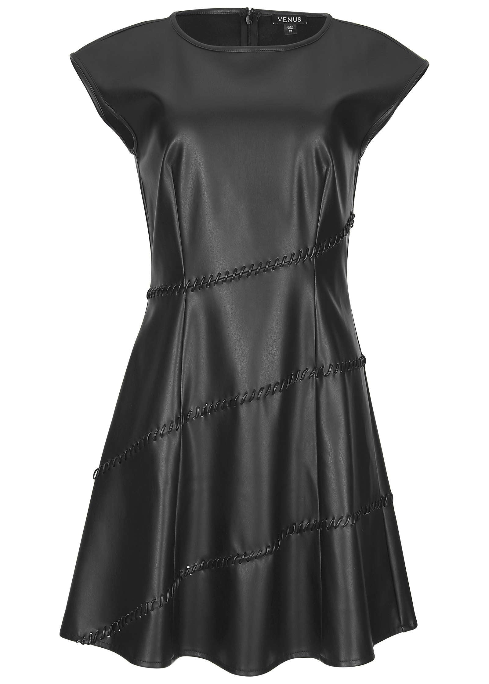 This bold mini is designed in our fan-fave faux-leather fabric that's so buttery-soft it makes the real deal jealous! It even has a knit backing which adds comfy stretch and hugs your curves for a flattering fit. When it comes to looks. this dress brings it. Trendy whipstitch details on the skirt up the edge and create a one-of-a-kind look that'll have everyone asking. "where did you get that?"* Sizes: XS (2). S (4-6). M (8-10). L (12-14). XL (16)* Plus sizes: 1X (18-20). 2X (22-24). 3X (26-28)* Sleeveless* Back zipper closure* A-line* Polyurethane. Imported