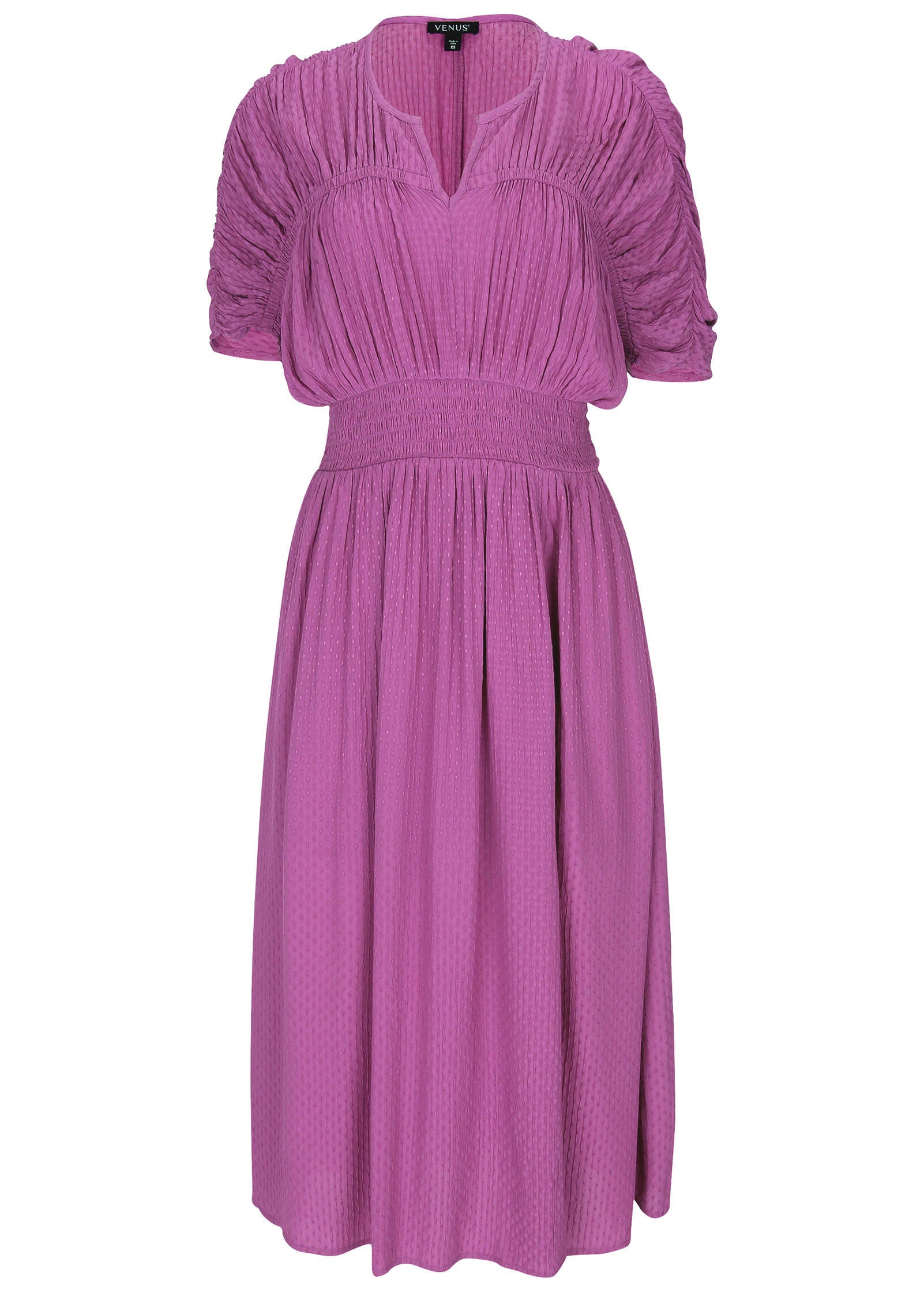 From family brunches to weddings. this short sleeve midi can go anywhere. The V-neckline adds a touch of elegance. while the smocked waist flatters your figure. A side slit gives it a modern twist. making this dress a versatile choice for every warm-weather occasion. * Sizes: XS (2). S (4-6). M (8-10). L (12-14). XL (16)* Short sleeves: Ideal for warmer days.* V-neckline: A flattering and feminine touch.* Smocked waist: Defines your waist for a comfortable. flattering fit.* Side slit: Adds a modern edge to the classic midi design.* Viscose. Imported