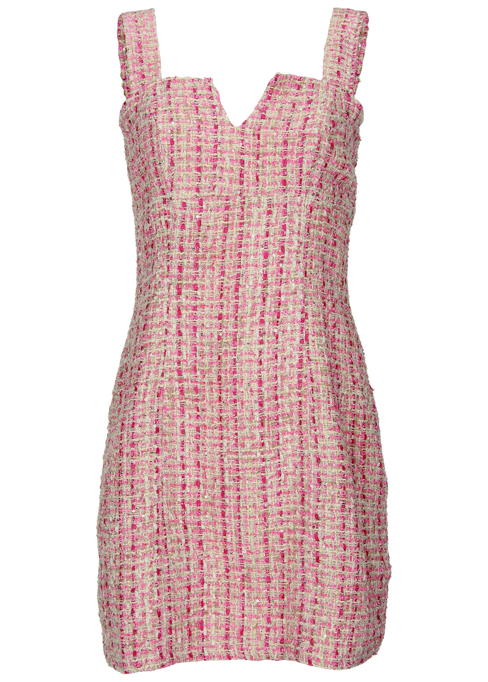 Shine bright in this sparkle-infused tweed mini dress that brings the glam to any occasion. With a notched V-neckline and sleeveless design. it's the perfect piece for showing off your style. Whether worn solo for a chic. stand-out look or paired with the Sparkle Tweed Blazer for a coordinated. sophisticated outfit. this dress has got you covered.* Sizes: XS (2). S (4-6). M (8-10). L (12-14). XL (16)* Notched V-neckline: Adds a touch of sophistication and a flattering shape.* Sleeveless: Perfect for warmer days or layering for cooler evenings.* Sparkle-infused tweed fabric: Adds just the right amount of shimmer for a standout look.* Poly. Imported