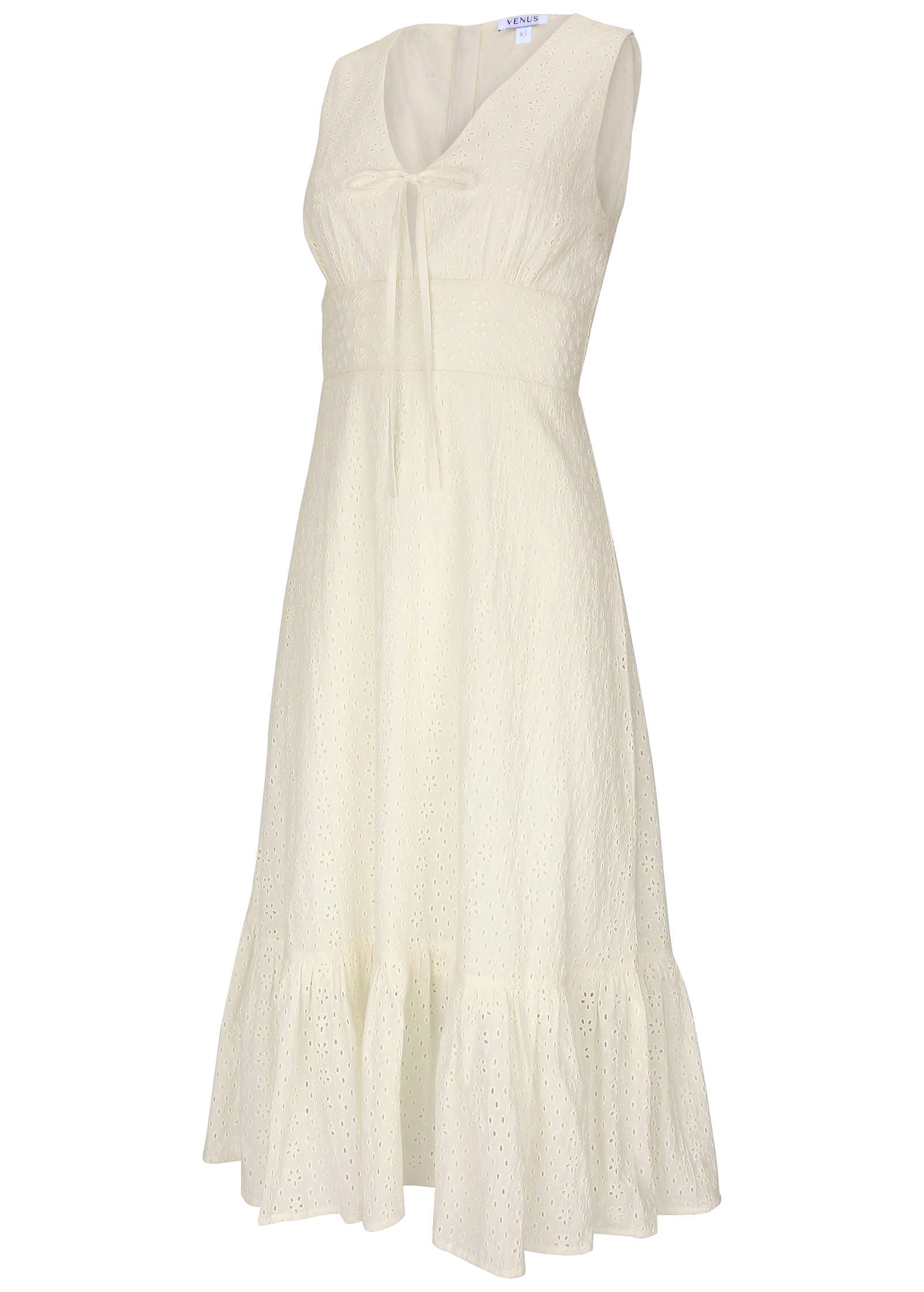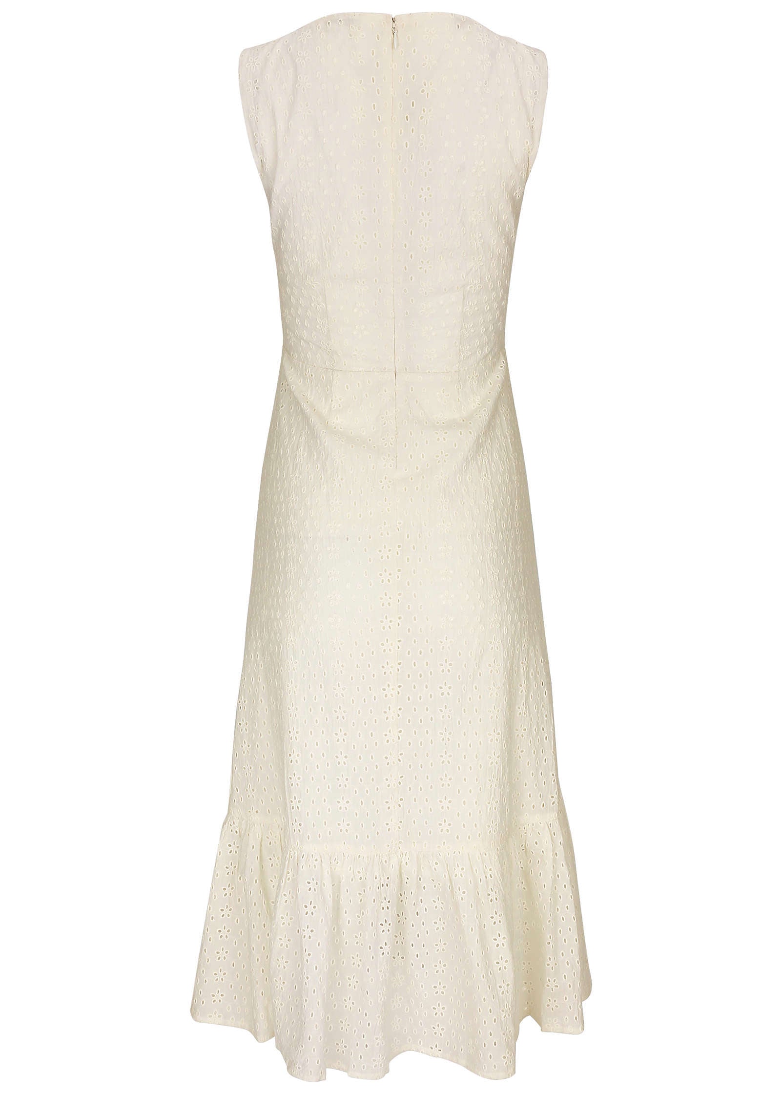 Embrace the airy charm of this sleeveless eyelet midi dress. designed to elevate your spring wardrobe. The V-neckline and keyhole detail add a touch of sophistication. while the breezy cotton fabric and ruffled hem create a relaxed yet polished look. Whether you're strolling through a weekend market or indulging at brunch. this dress has you covered.* Sizes: XS (2). S (4-6). M (8-10). L (12-14). XL (16)* V-neckline: Flattering and feminine for a classic silhouette.* Keyhole detail: Adds a playful touch of skin.* Eyelet detail: Intricate design that brings texture and elegance.* Ruffle on hem: Feminine flair for added movement.* Breezy cotton: Perfect for warm weather with comfort in mind.* Back zipper closure: Smooth. easy wear.* Semi-lined: Light and breathable for the season.* Cotton. Imported