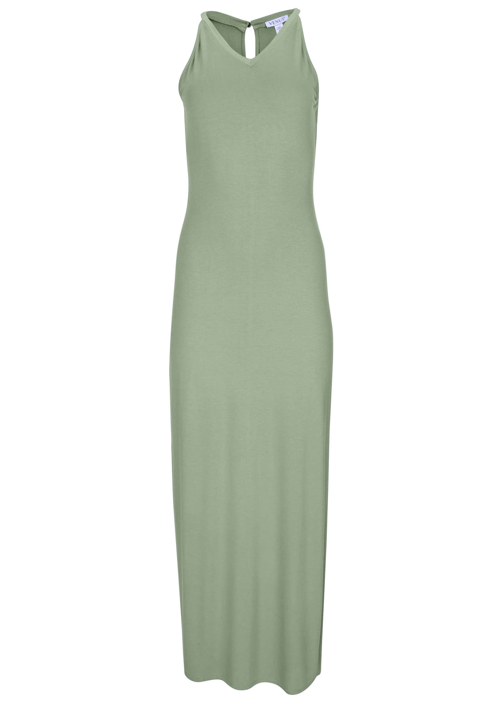 This halter maxi dress is all about breezy elegance. featuring a sleek sleeveless design. a sultry side slit. and a flowy maxi length that moves with you. Whether you're strolling through a resort or heading out for date night. this dress is a must-pack for warm-weather adventures.* Sizes: XS (2). S (4-6). M (8-10). L (12-14). XL (16)* Plus sizes: 1X (18-20). 2X (22-24). 3X (26-28)* Sleeveless: Keeps you cool and stylish.* Halter neckline: A classic. flattering fit.* Side slit: Just the right amount of leg for a flirty touch.* Maxi length: Flowy. elegant. and perfect for any occasion.* Ecovero viscose/spandex. Imported