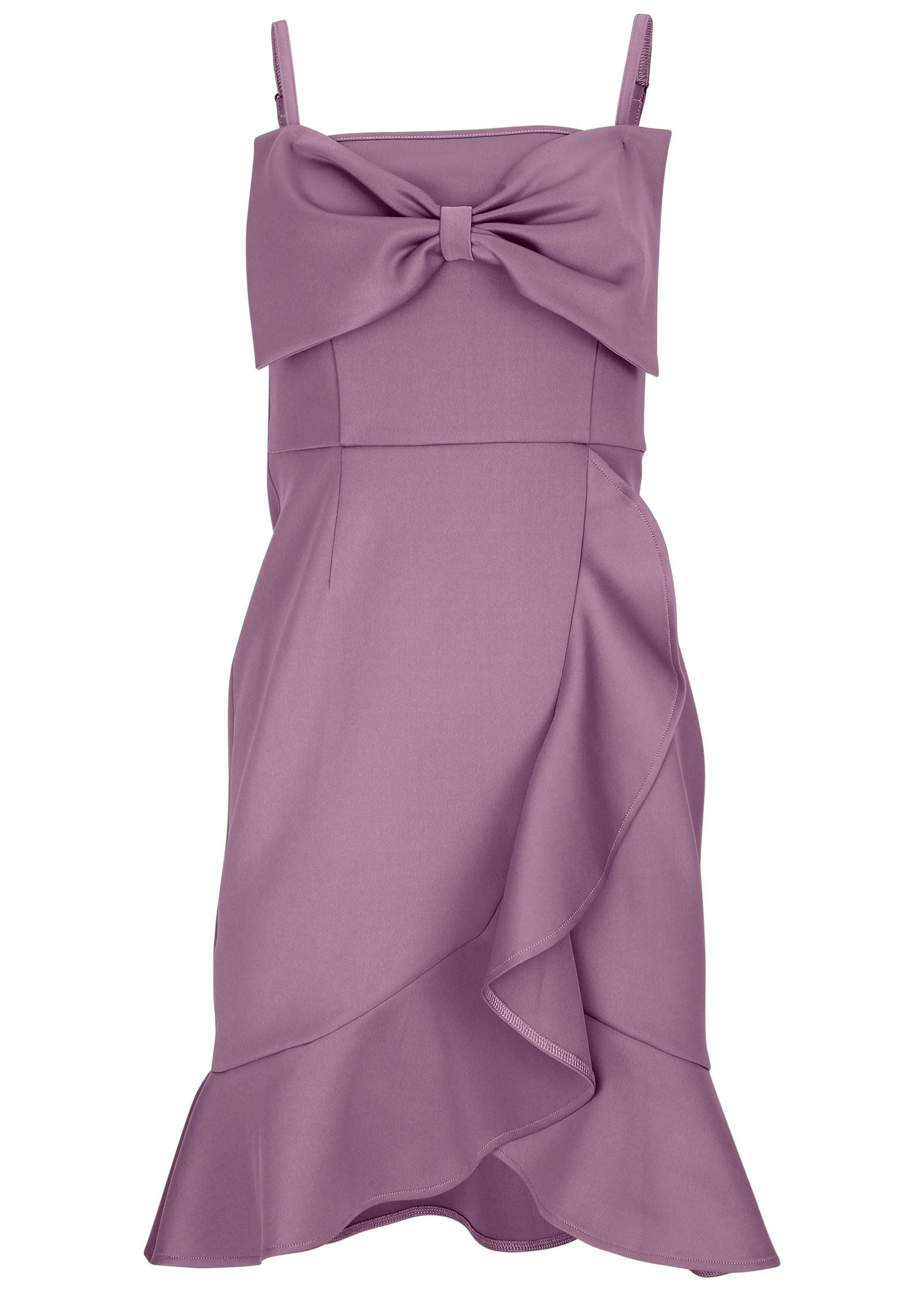 This sleeveless scuba dress is made to turn heads with its delicate spaghetti straps. statement bow detail. and playful ruffle along the skirt. A center back zipper closure ensures a sleek fit. while the lightweight. structured fabric keeps you looking polished from brunch to a dreamy vacation date night.* Sizes: XS (2). S (4-6). M (8-10). L (12-14). XL (16)* Sleeveless: A warm-weather must-have.* Spaghetti straps: Elegant and delicate.* Bow detail: A chic. feminine touch.* Ruffle along skirt: Adds movement and flair.* Center back zipper closure: Sleek and secure fit.* Fabric has stretch* Poly/spandex. Imported