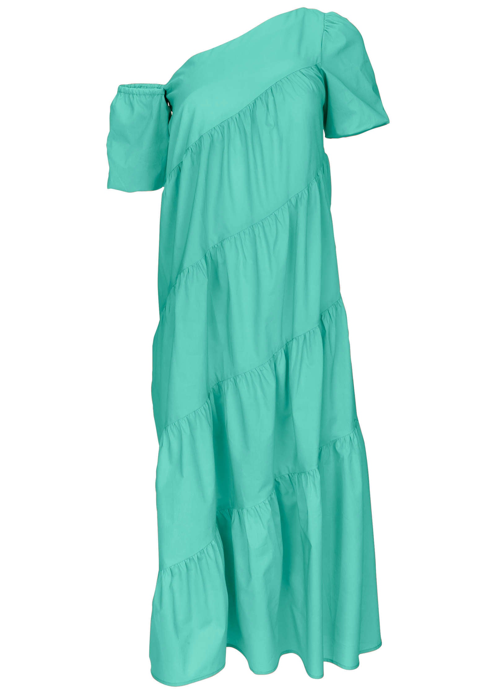 This breezy one-shoulder maxi is so versatile. you'll never want to leave home with out it. The asymmetrical neckline adds a modern. flirty touch. while the tiered skirt creates beautiful movement with every step. Perfect for everything from tropical getaways to summer soirées. this dress is as versatile as it is stylish. * Sizes: XS (2). S (4-6). M (8-10). L (12-14). XL (16)* One-shoulder neckline: A sleek. modern silhouette that turns heads.* Short sleeve: Adds a little coverage while keeping it lightweight.* Tiered skirt: Flowing. feminine. and perfect for twirling.* Cotton. Imported