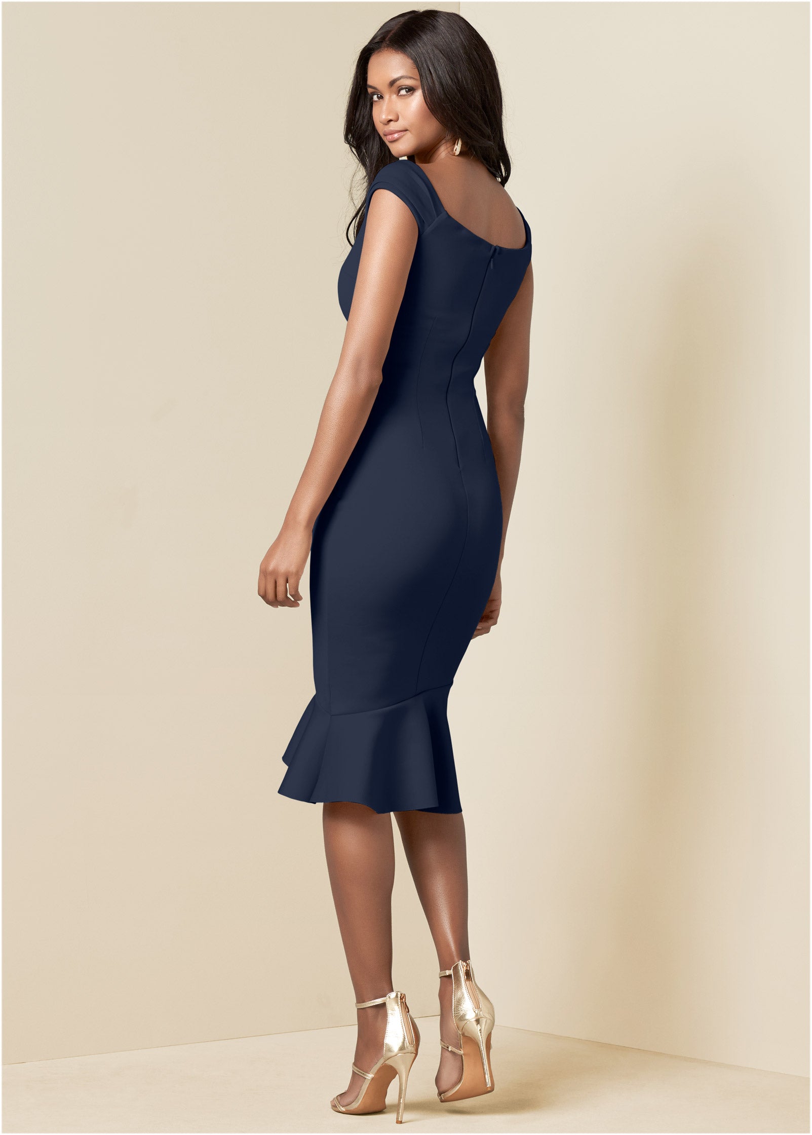 If you're looking for a dress that flatters (of course you are!) then stop the search. This knee-length number magically fits and flatters every size and shape. making it a best seller. The secret is in the silhouette that creates an hourglass shape. from the off-the-shoulder sleeves to the cinched waist to the ruffle hem that floats out at the knee. Moral of the story: add this to your closet ASAP!* Sizes: XS (2). S (4-6). M (8-10). L (12-14). XL (16)* Plus sizes: 1X (18-20). 2X (22-24). 3X (26-28)* Knee length. 38" from shoulder* Off-the-shoulder* Invisible back zipper closure* Ruffle details* Polyester/elastane. Imported