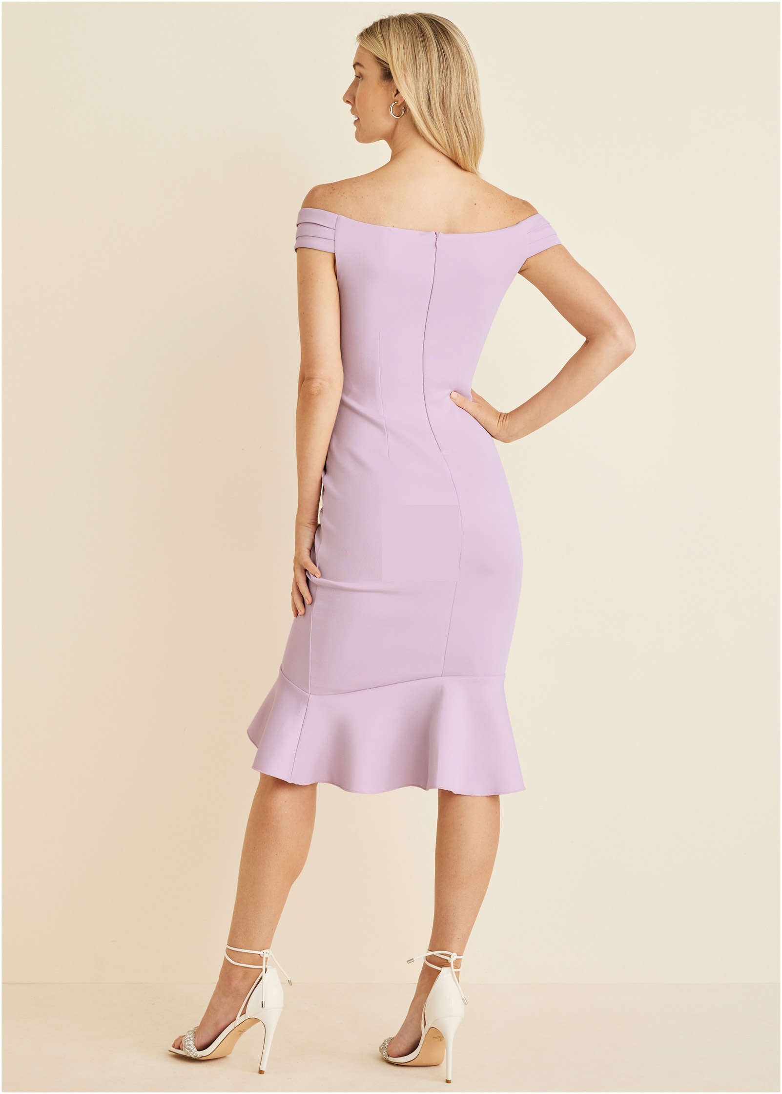 If you're looking for a dress that flatters (of course you are!) then stop the search. This knee-length number magically fits and flatters every size and shape. making it a best seller. The secret is in the silhouette that creates an hourglass shape. from the off-the-shoulder sleeves to the cinched waist to the ruffle hem that floats out at the knee. Moral of the story: add this to your closet ASAP!* Sizes: XS (2). S (4-6). M (8-10). L (12-14). XL (16)* Plus sizes: 1X (18-20). 2X (22-24). 3X (26-28)* Knee length. 38" from shoulder* Off-the-shoulder* Invisible back zipper closure* Ruffle details* Polyester/elastane. Imported