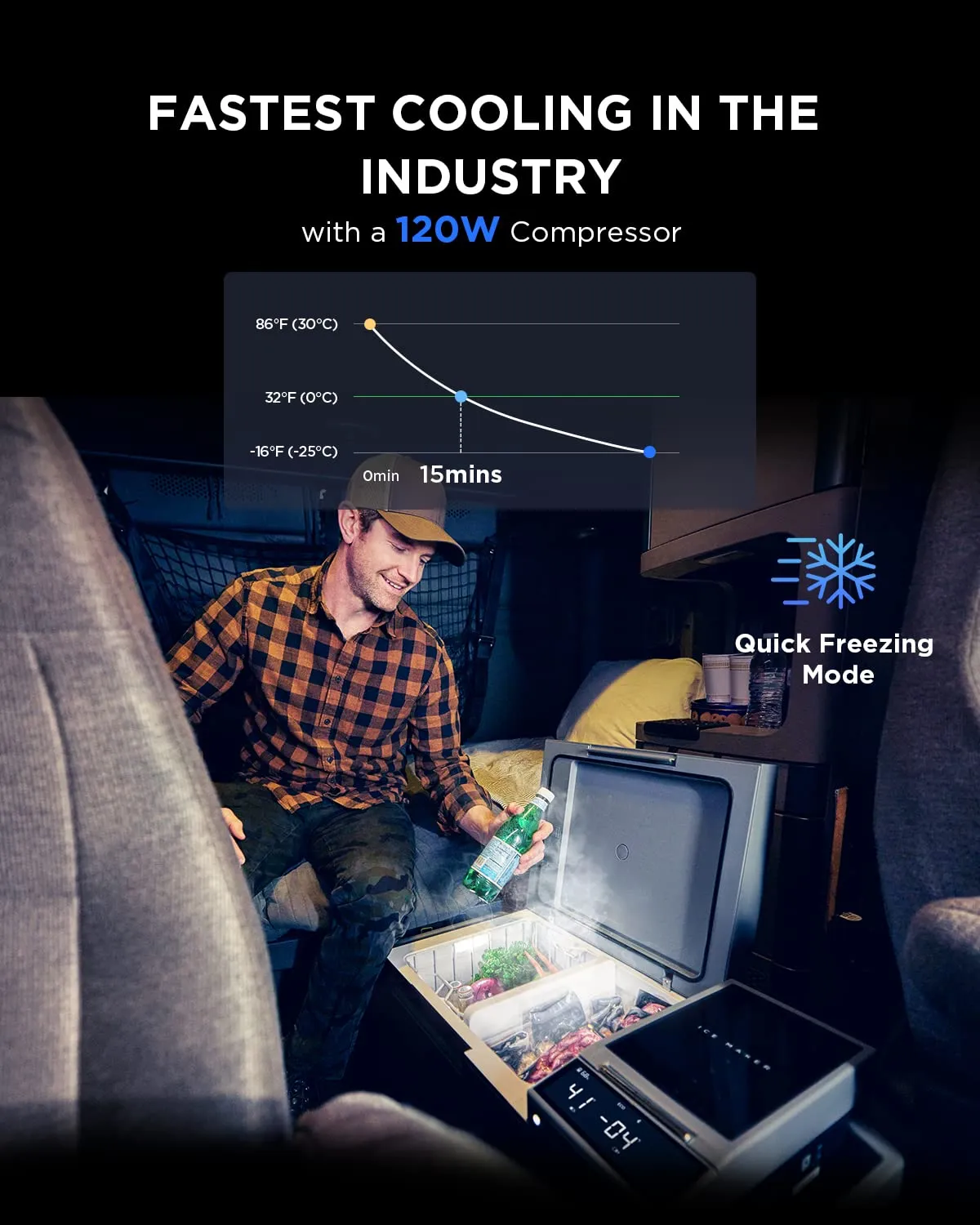 - Industry's First Integrated Ice Maker In addition to freezing. this portable car refrigerator can also bring you 18 solid ice cubes in 12 minutes by a 120w powerful compressor