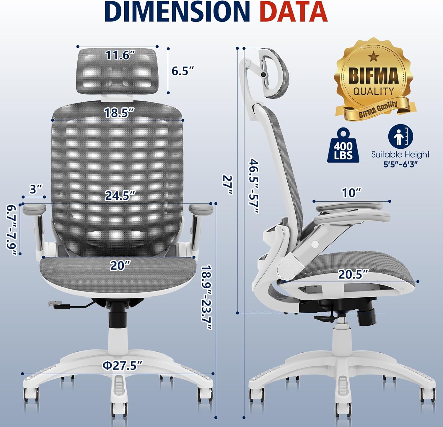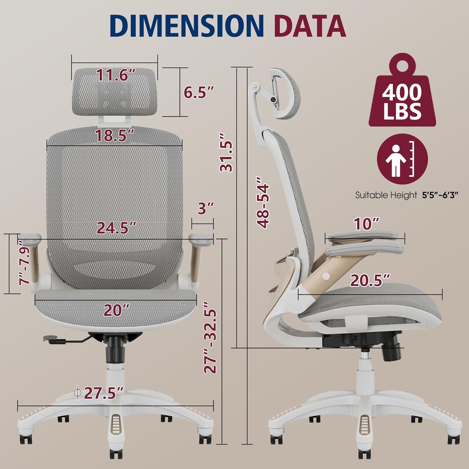 - 【COMFORTABLE MESH SEAT】- The office chair is larger than other chairs. and it could accommodate different body build. The whole Chair Dimensions(including the arms): 25.6"W x 22"D x 45.3"-54.9"H. the Seat Dimensions: 20"W x 19.3"D x 18.5"-22.05"H. Loading Capacity: 400 lbs. The recline function makes you tilt the backrest back (90~120°) or sit straight freely.
