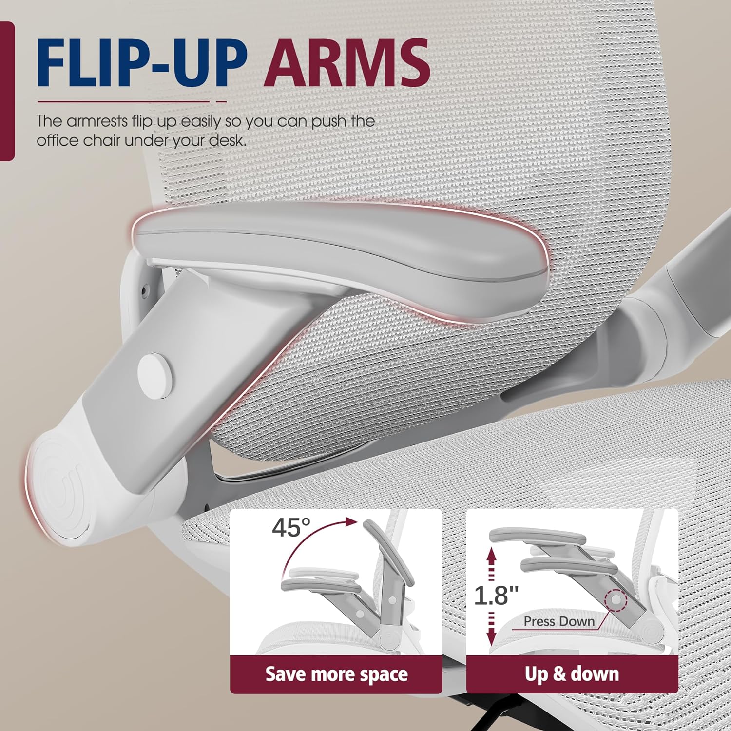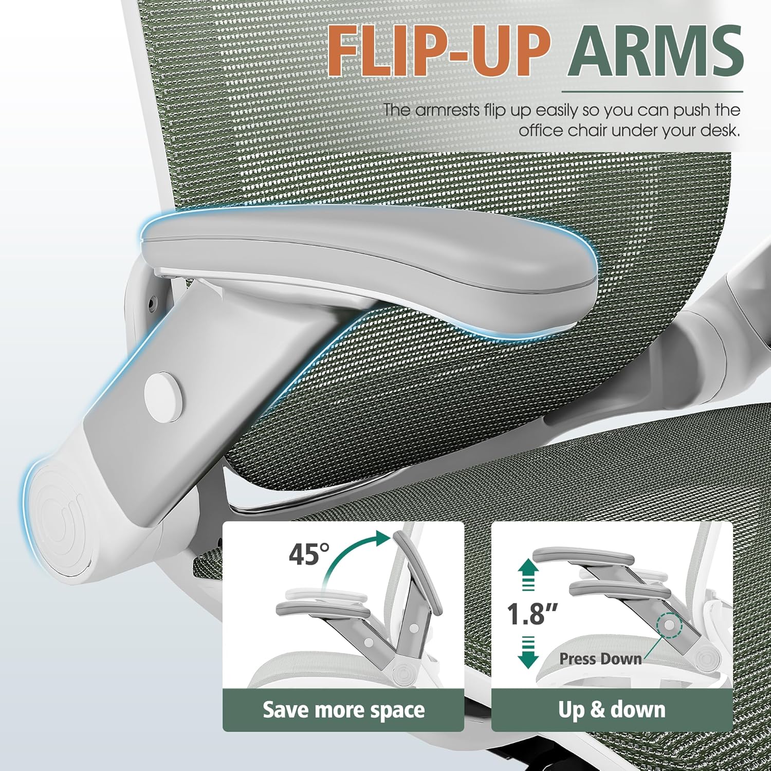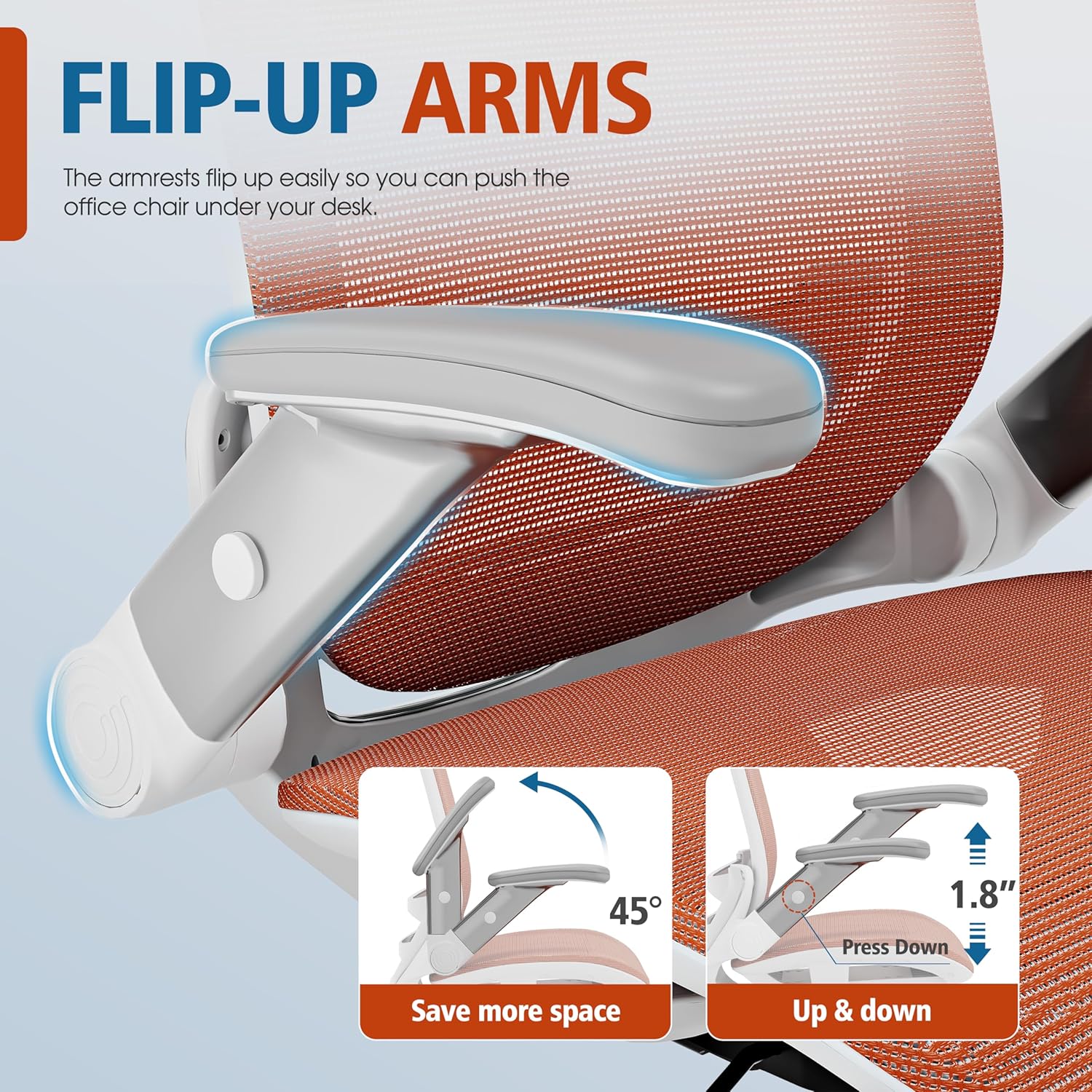 - 【ADJUSTABLE FLIP-UP ARMREST】- Folding the armrests up 45°. you can push the executive office chairs directly under the desk to save valuable space. It's easy to raise or lower the folding armrest by pressing the black buttons on the armrest.