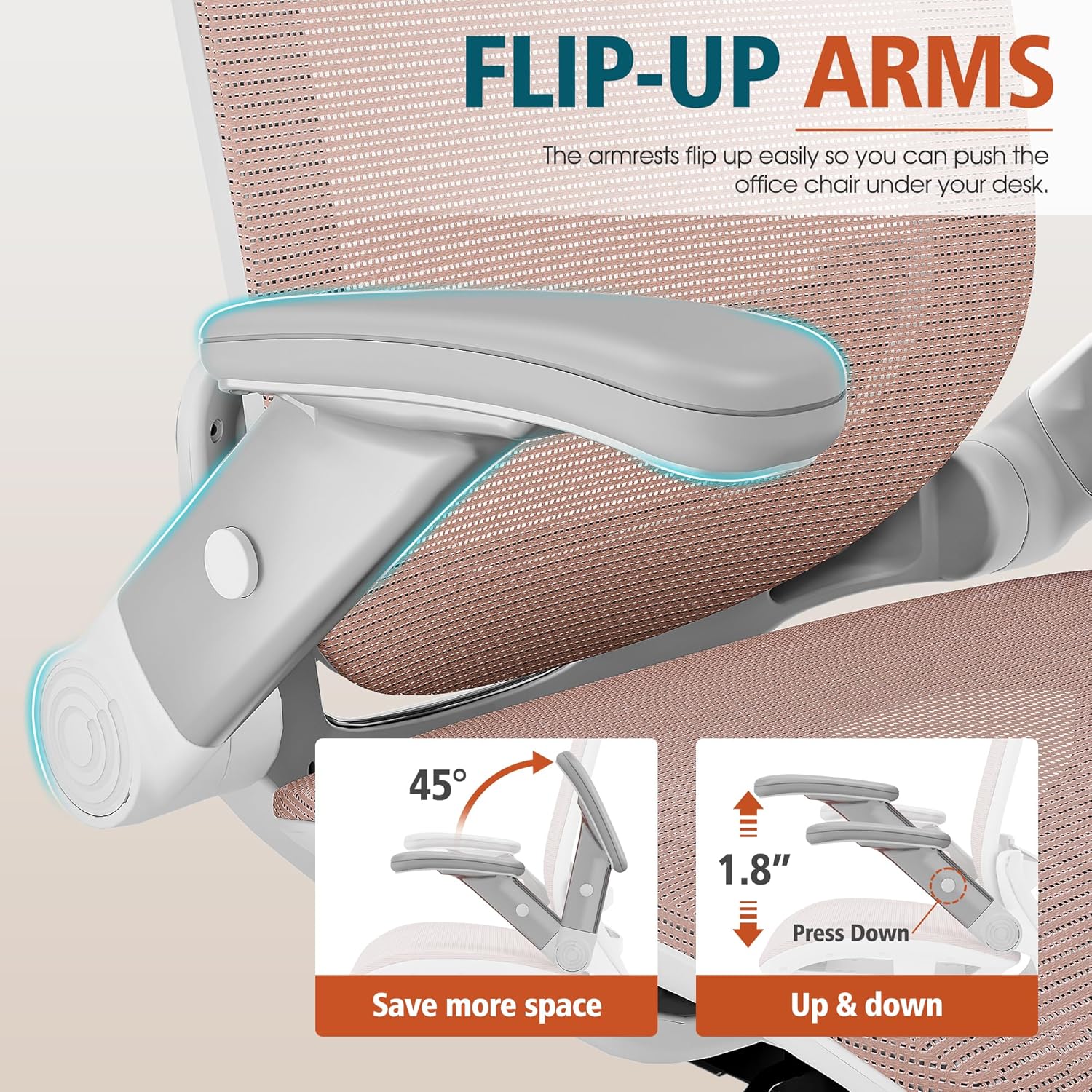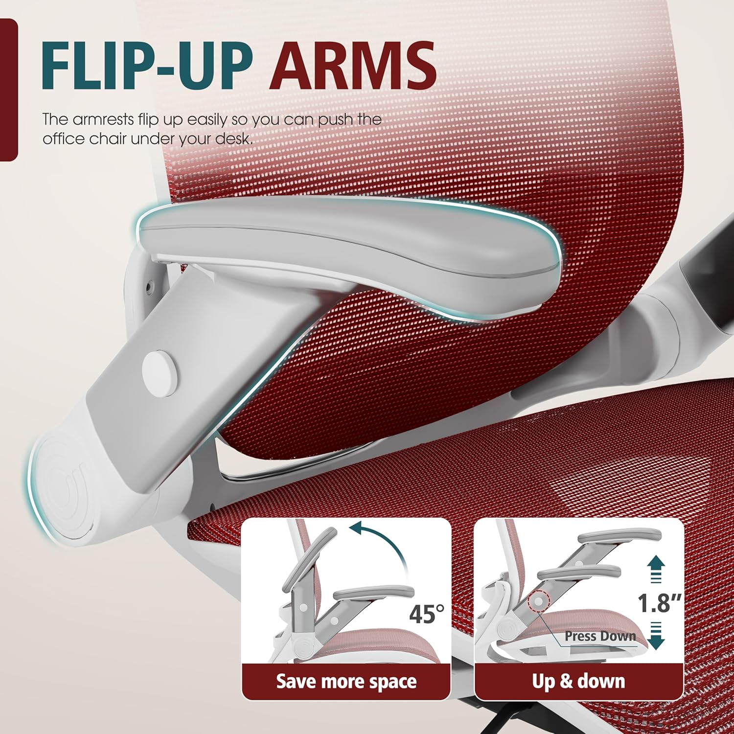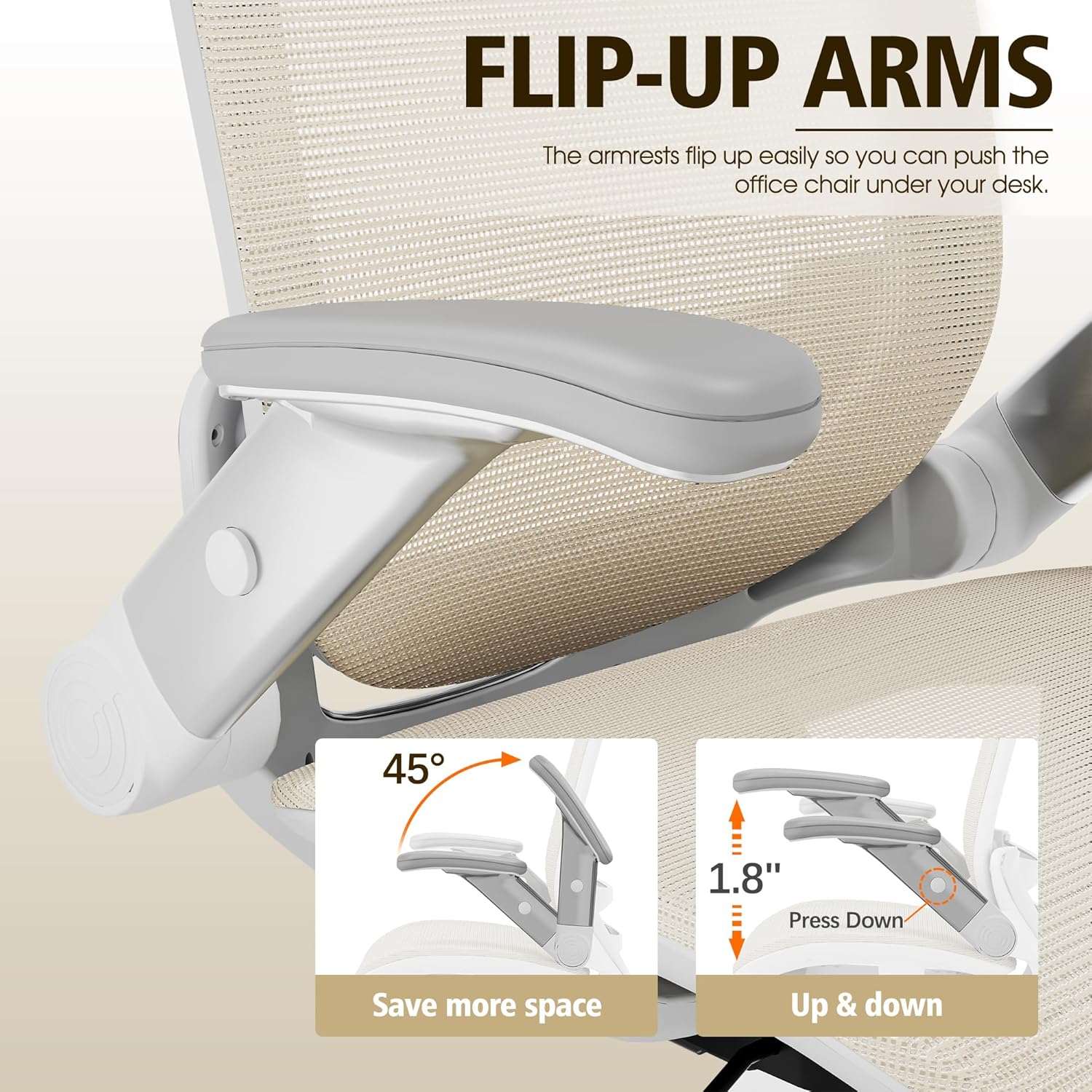 - 【ADJUSTABLE FLIP-UP ARMREST】- Folding the armrests up 45°. you can push the executive office chairs directly under the desk to save valuable space. It's easy to raise or lower the folding armrest by pressing the black buttons on the armrest.