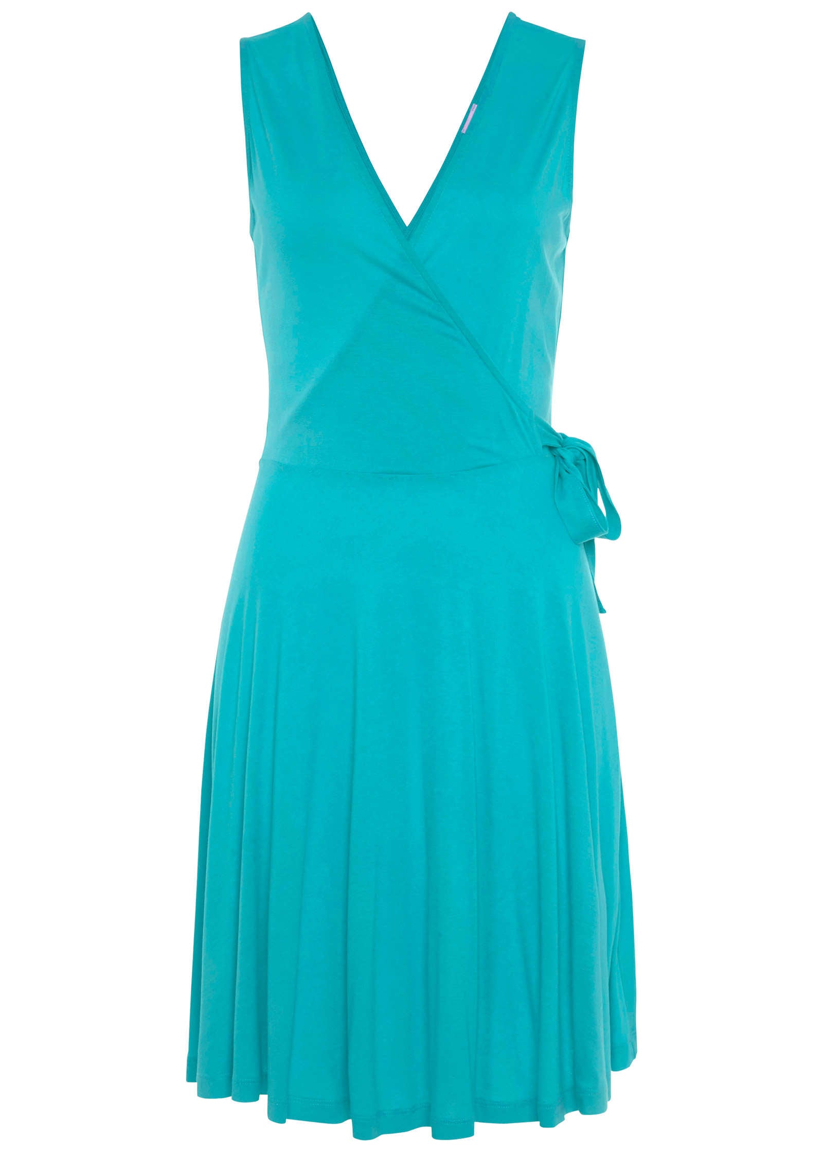 Warm weather has met its match! This dress gives the illusion of a wrap silhouette with a V-neckline and tie detail at the side of the waist. With a twirly. A-line skirt. this mini is ready to stylishly take on sunny days.* Sizes: XS (2). S (4-6). M (8-10). L (12-14). XL (16)* Sleeveless* V-neck* Mini length* Viscose. Imported