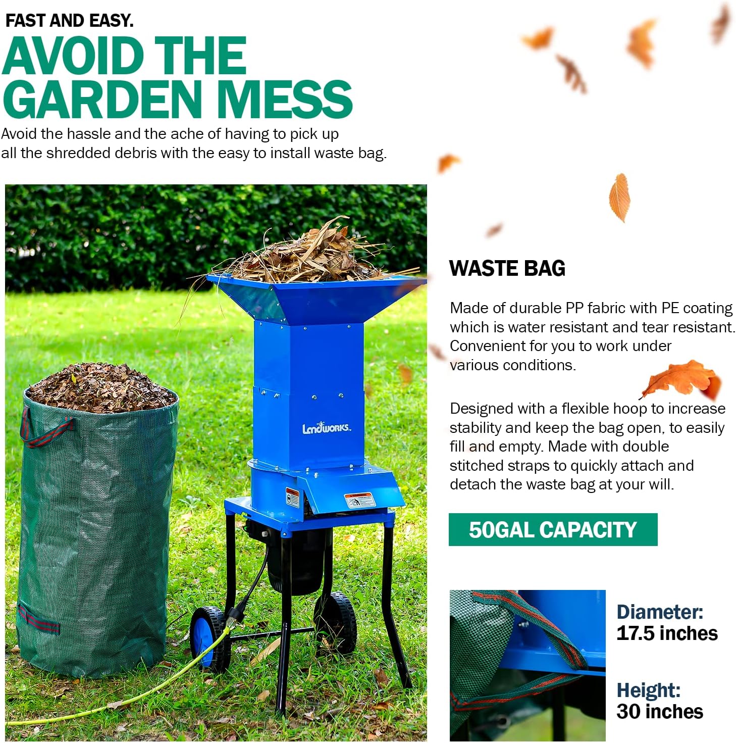 - DESIGN & CAPABILITIES - Great choice for Green Renewable recycling & Waste Management.The durable Steel housing is supported by a firm & sturdy powder coated steel frame. protecting the motor assembly.. Our Leaf Mulcher is equipped w/ an instant start switch & Overload Protection switch. Included are (2) 6” wheels to make transporting easy. Waste Catch Bag Made of Durable PP fabric with PE coating. which is water and tear resistant.