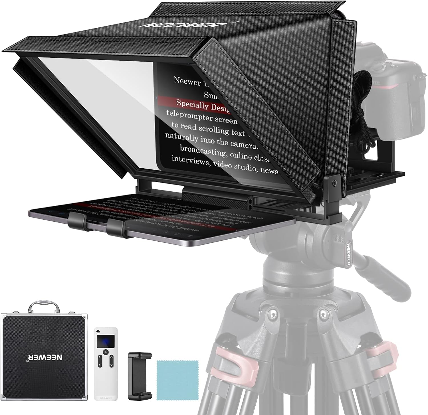 - Package Contents 1 x NEEWER Teleprompter. 1 x RT-110 Remote Control. 1 x Phone Holder. and 1 x Carrying Case (the upgraded NEEWER Teleprompter App is available for download in App store. Google play)